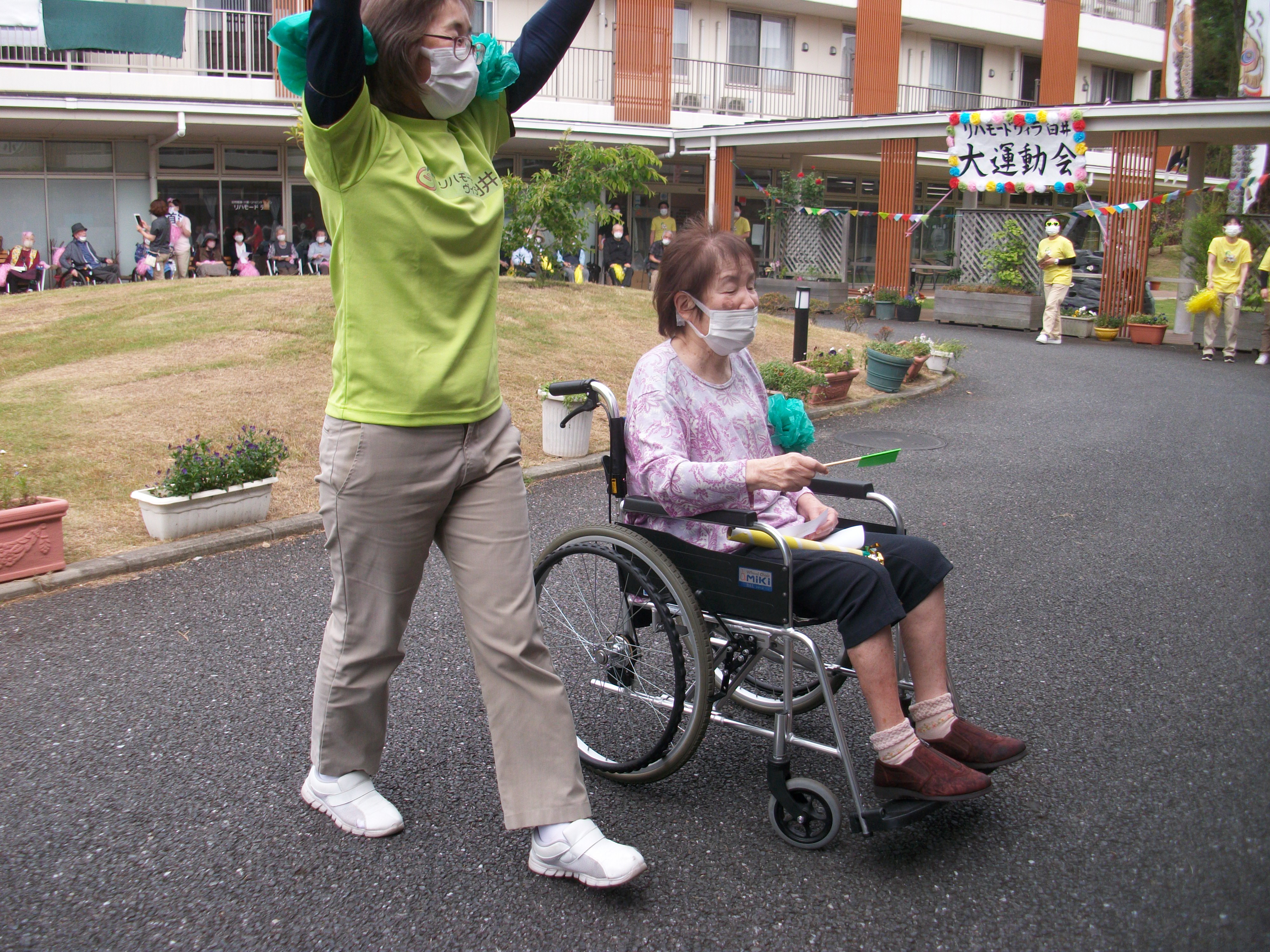選抜メンバーがいつもは入居者様が利用する車いすに乗ってロータリーを一周です!