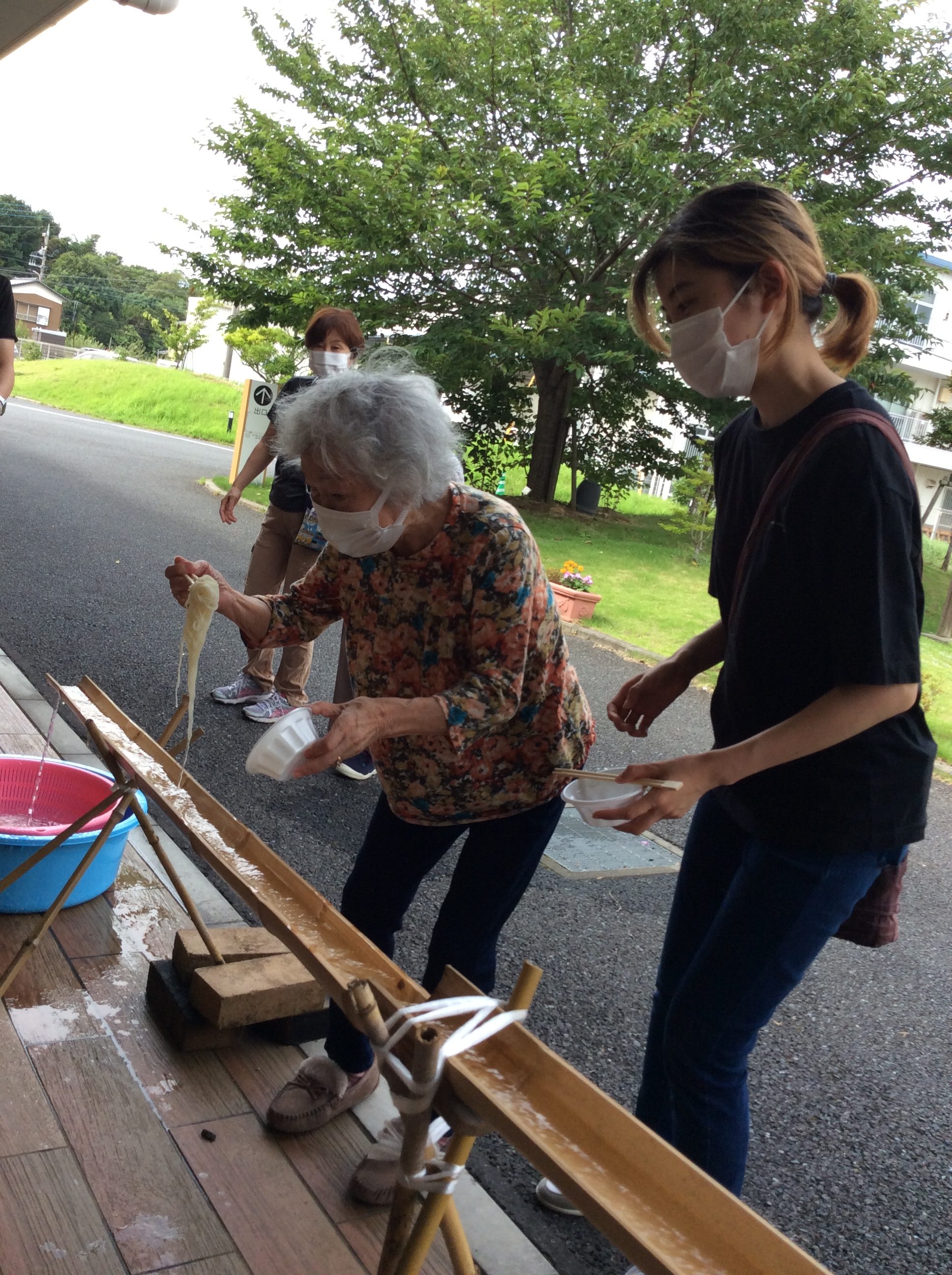流しそうめんを狙いを定めて「えいっ!」とすくったら、すごい大量!