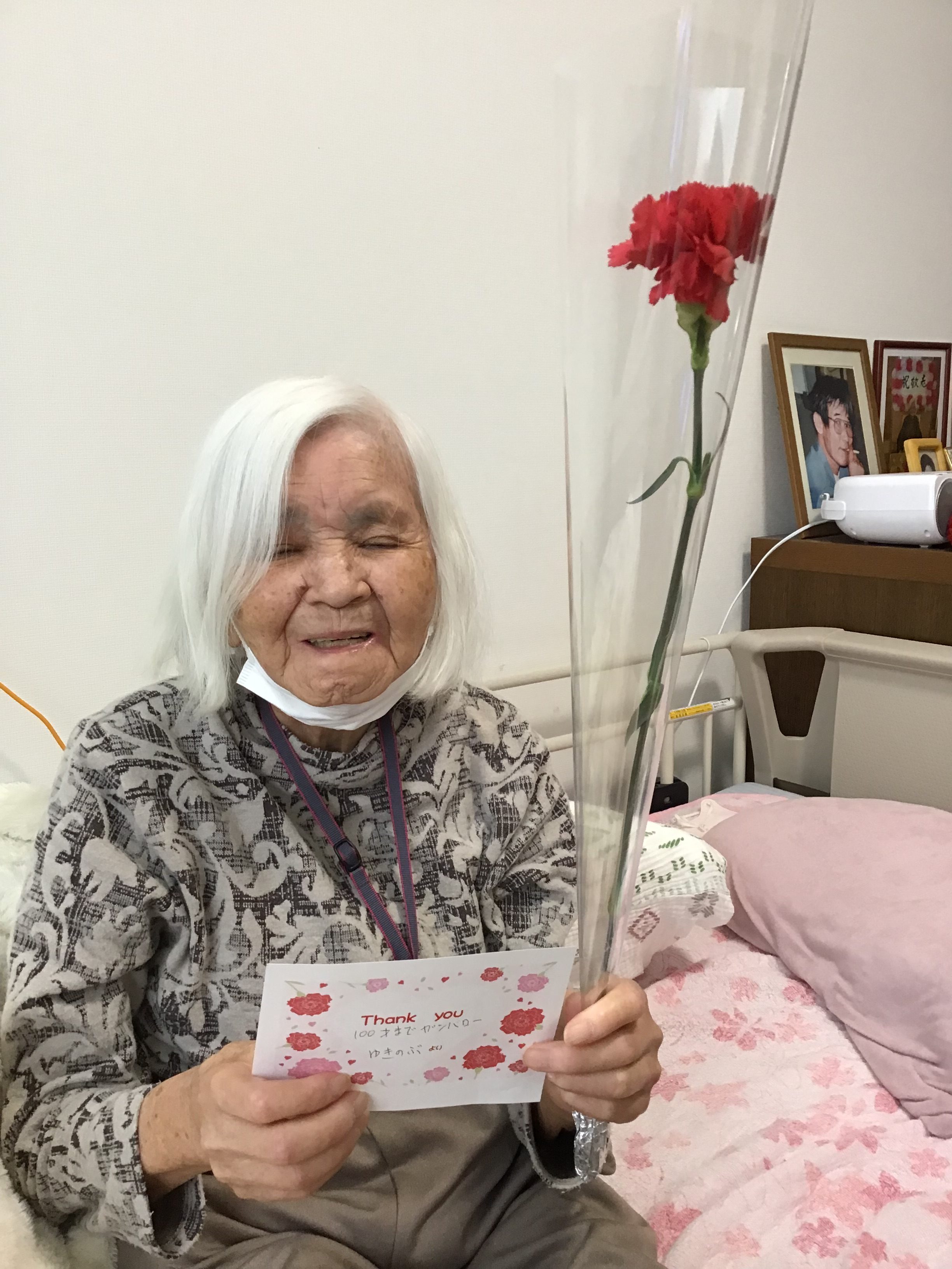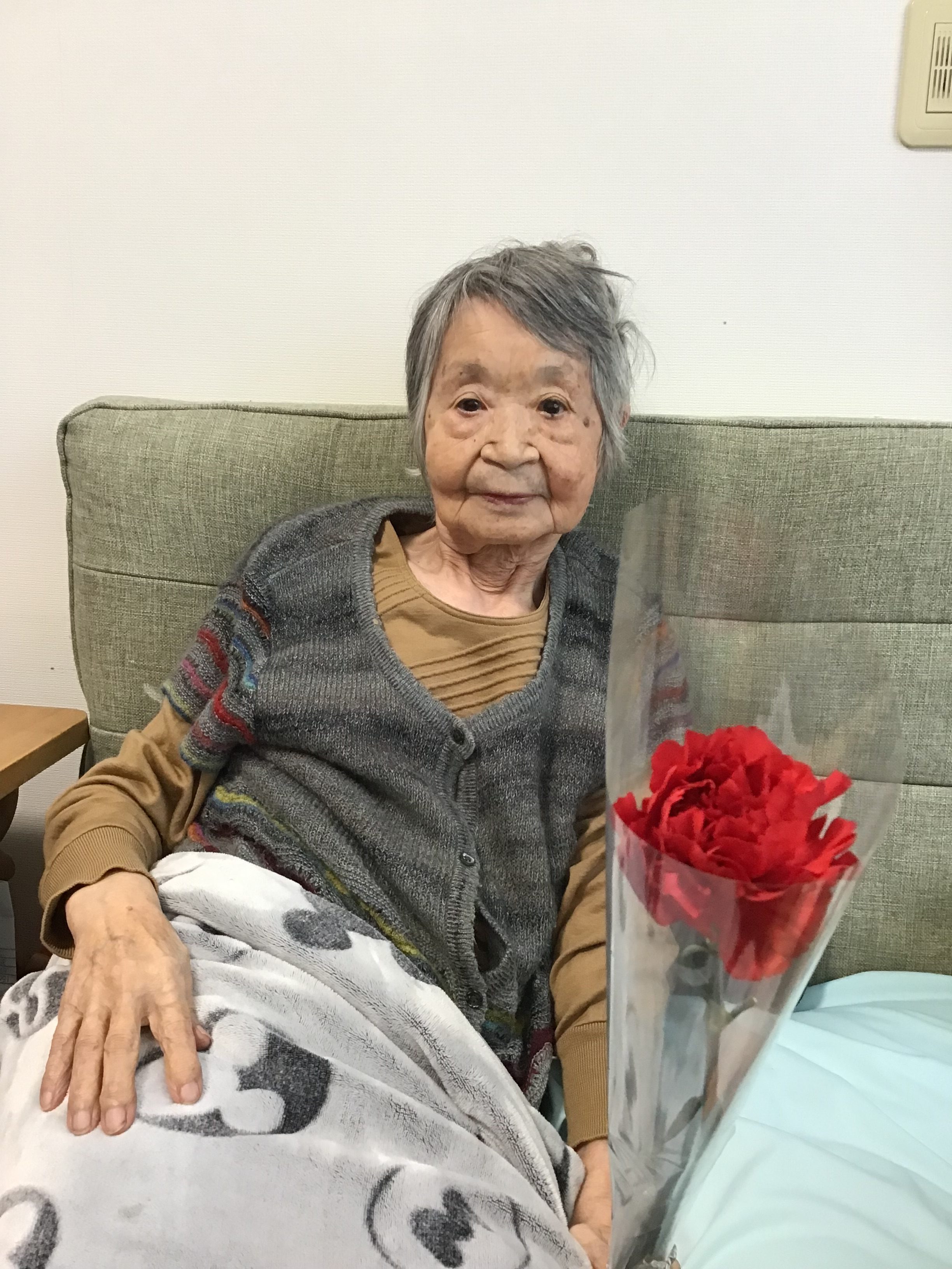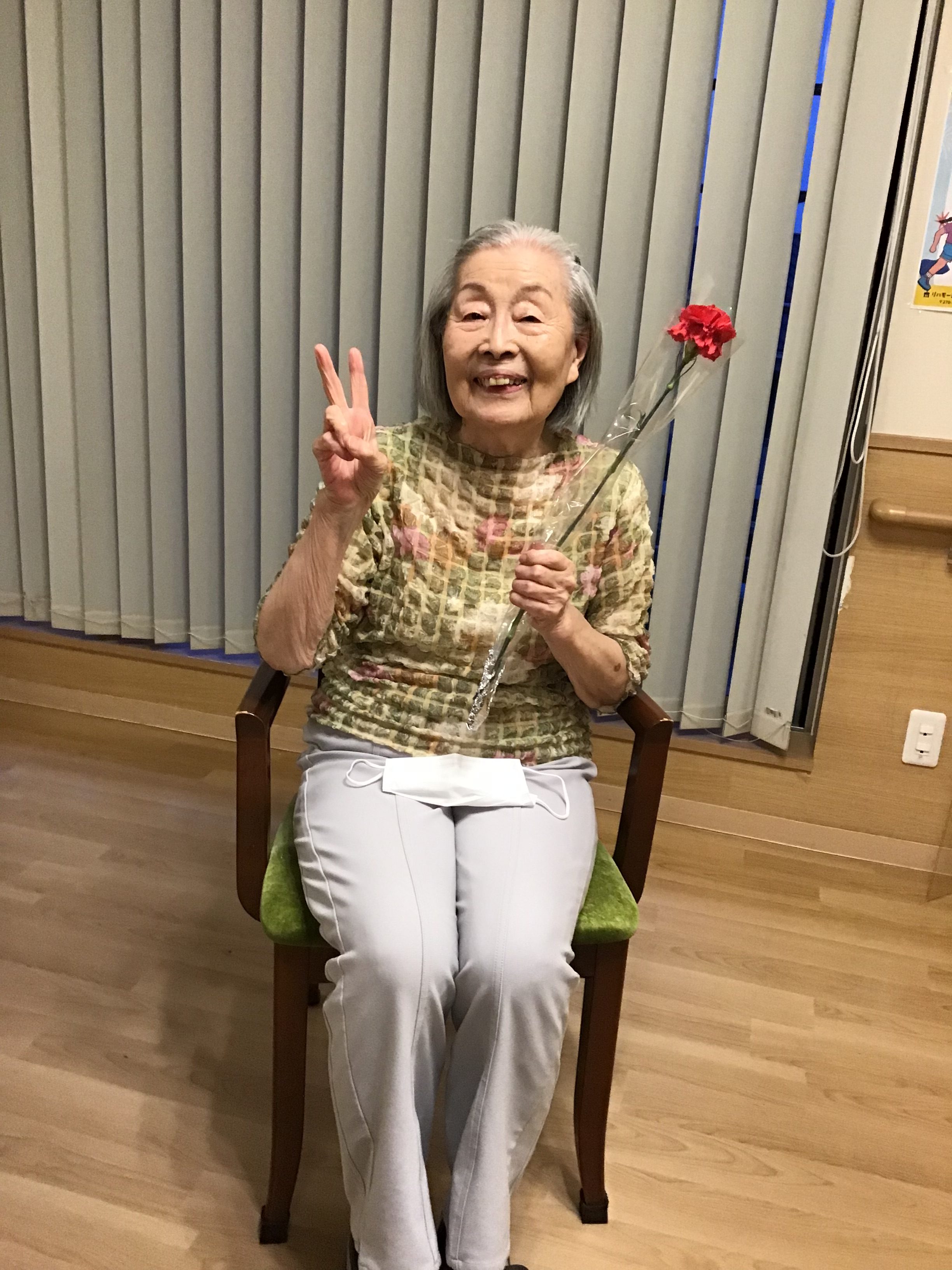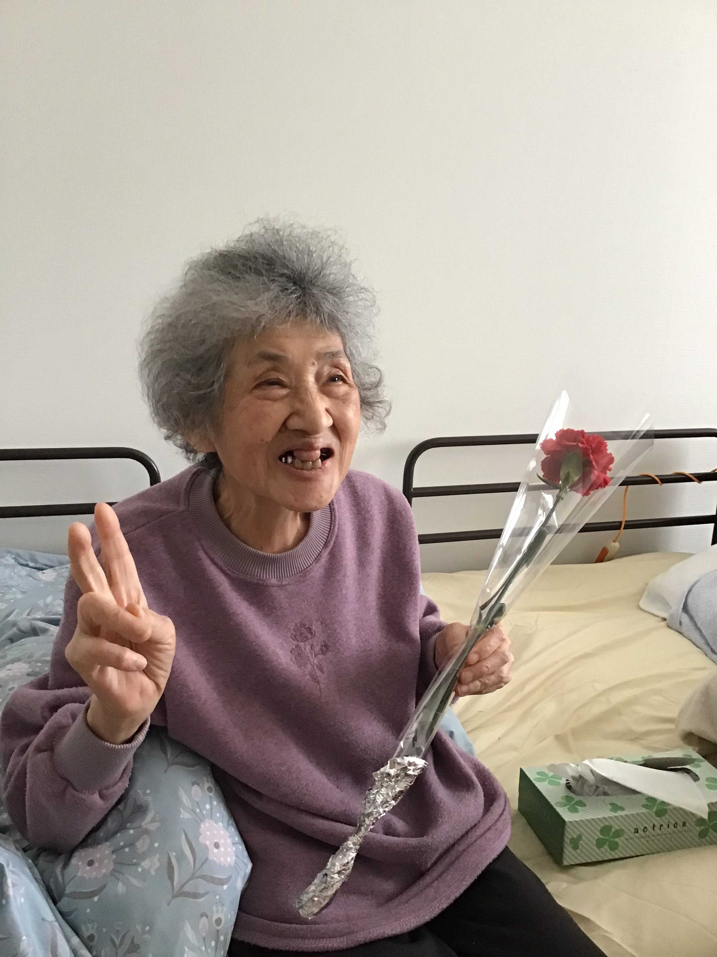 母の日に、カーネーションとご家族からのハガキをお渡しいたしました。