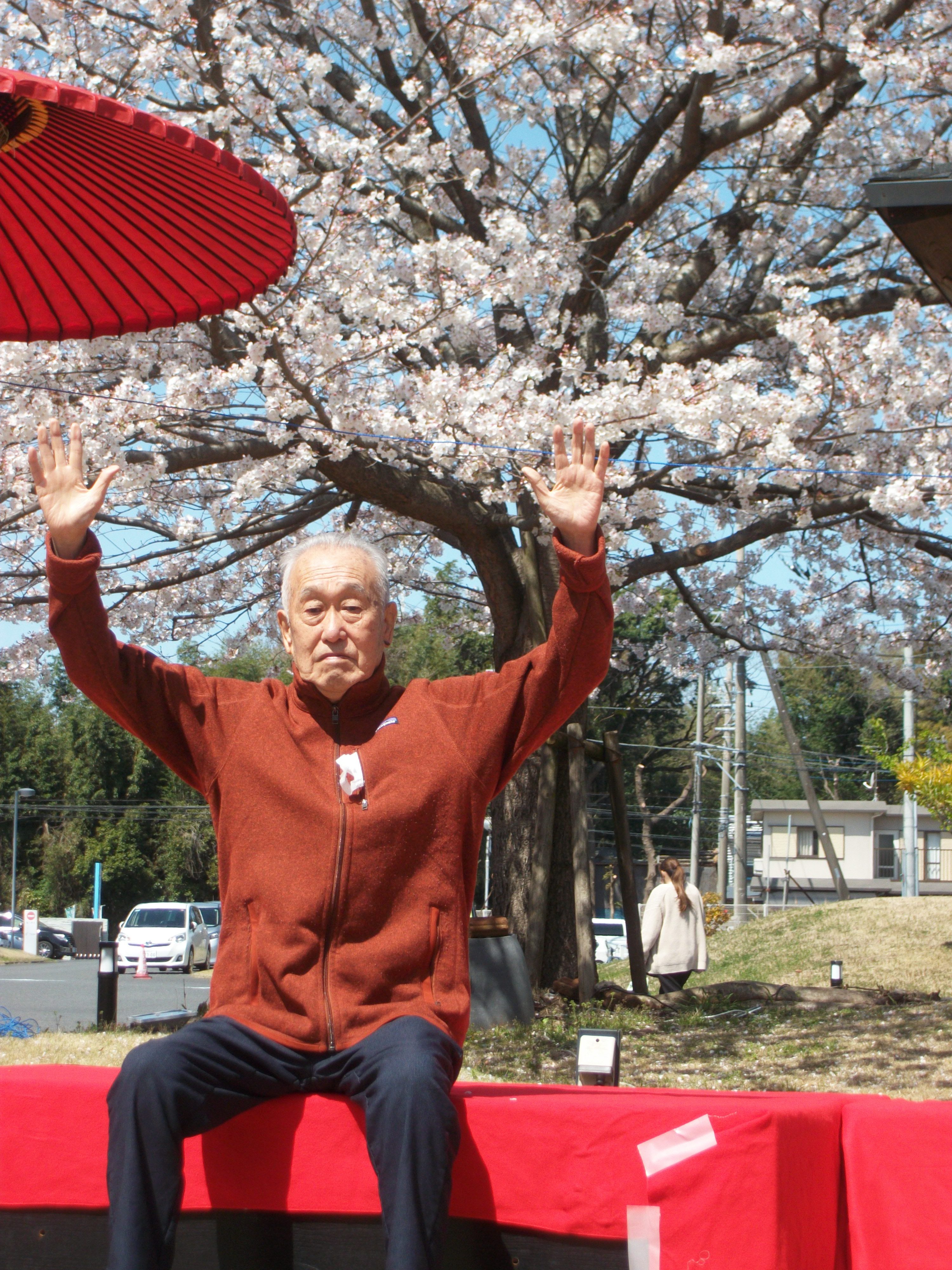 赤い番傘とちゃぶ台を置いて皆さん交代で記念撮影です。