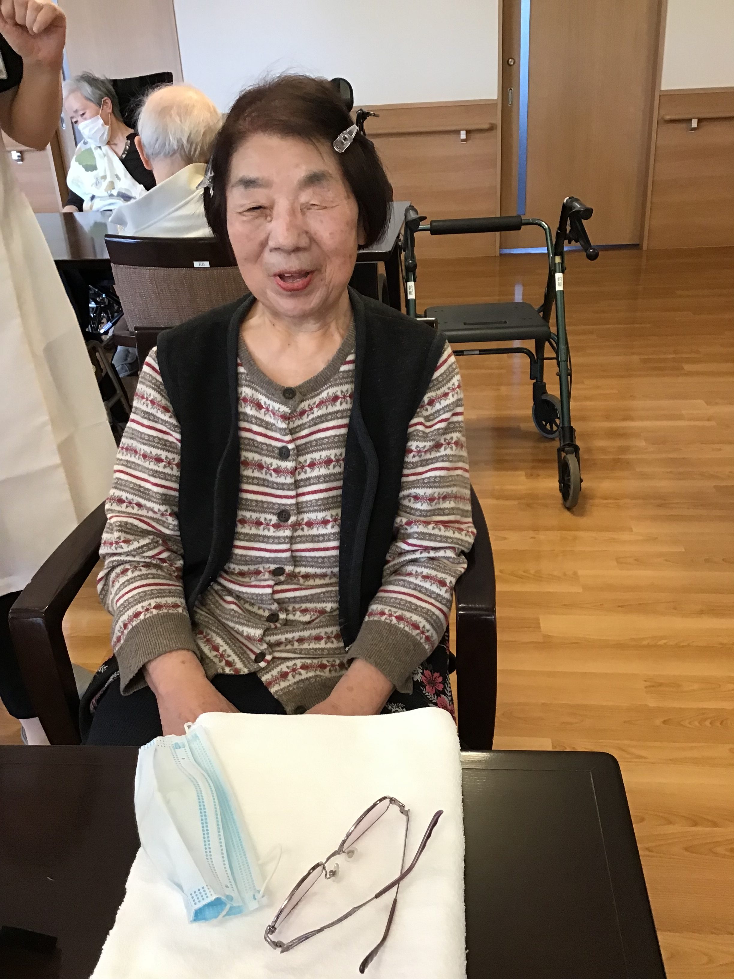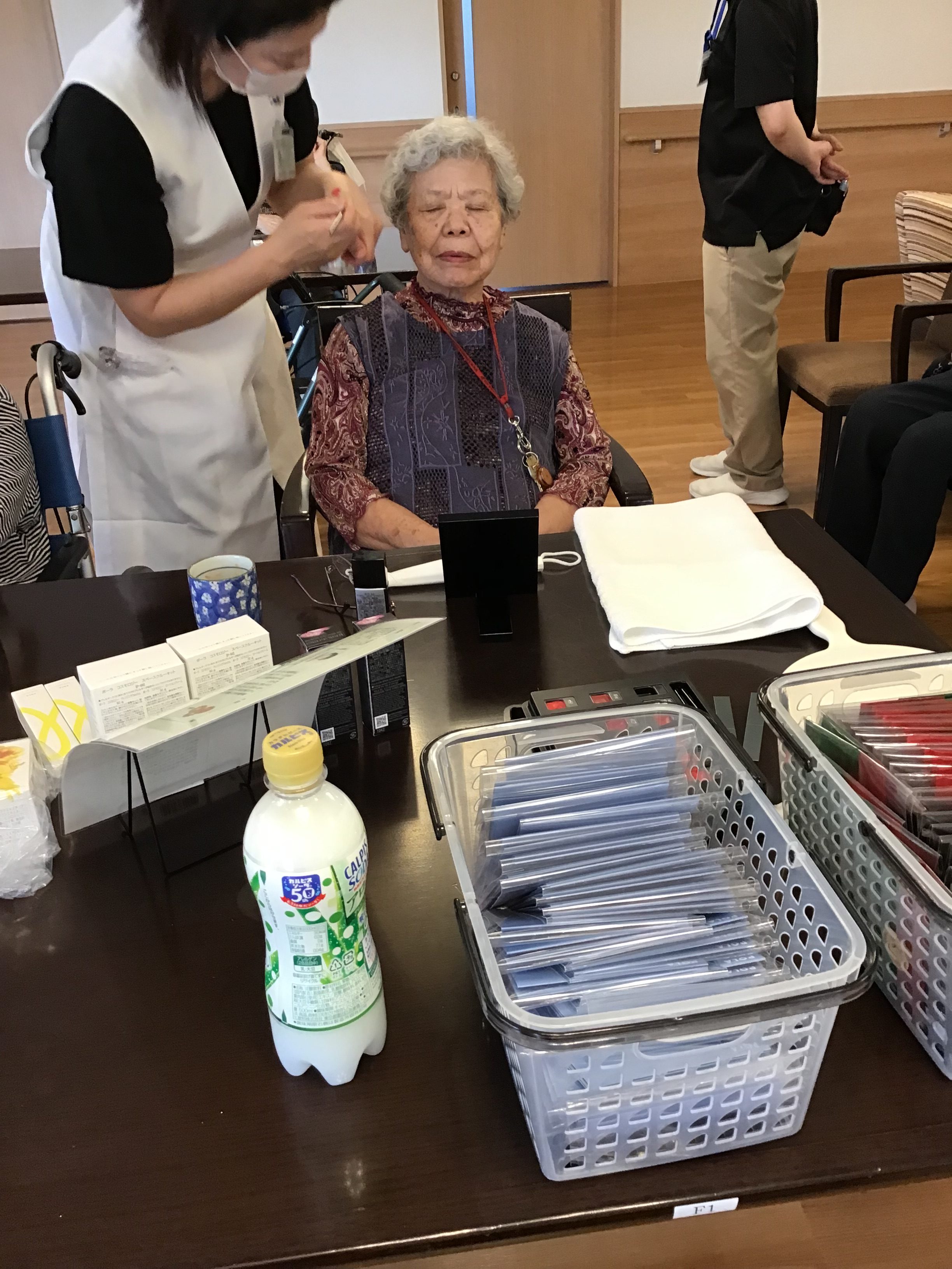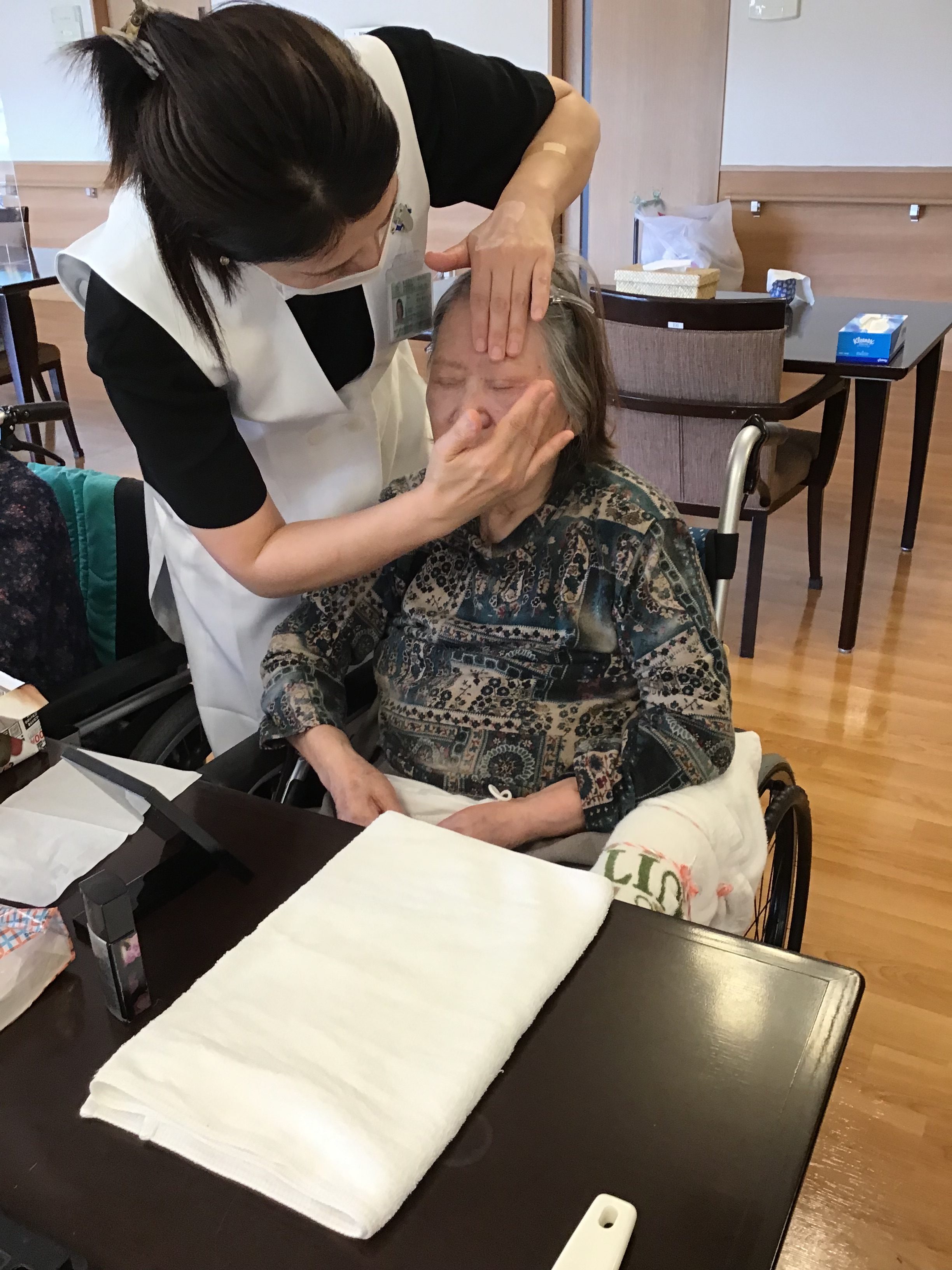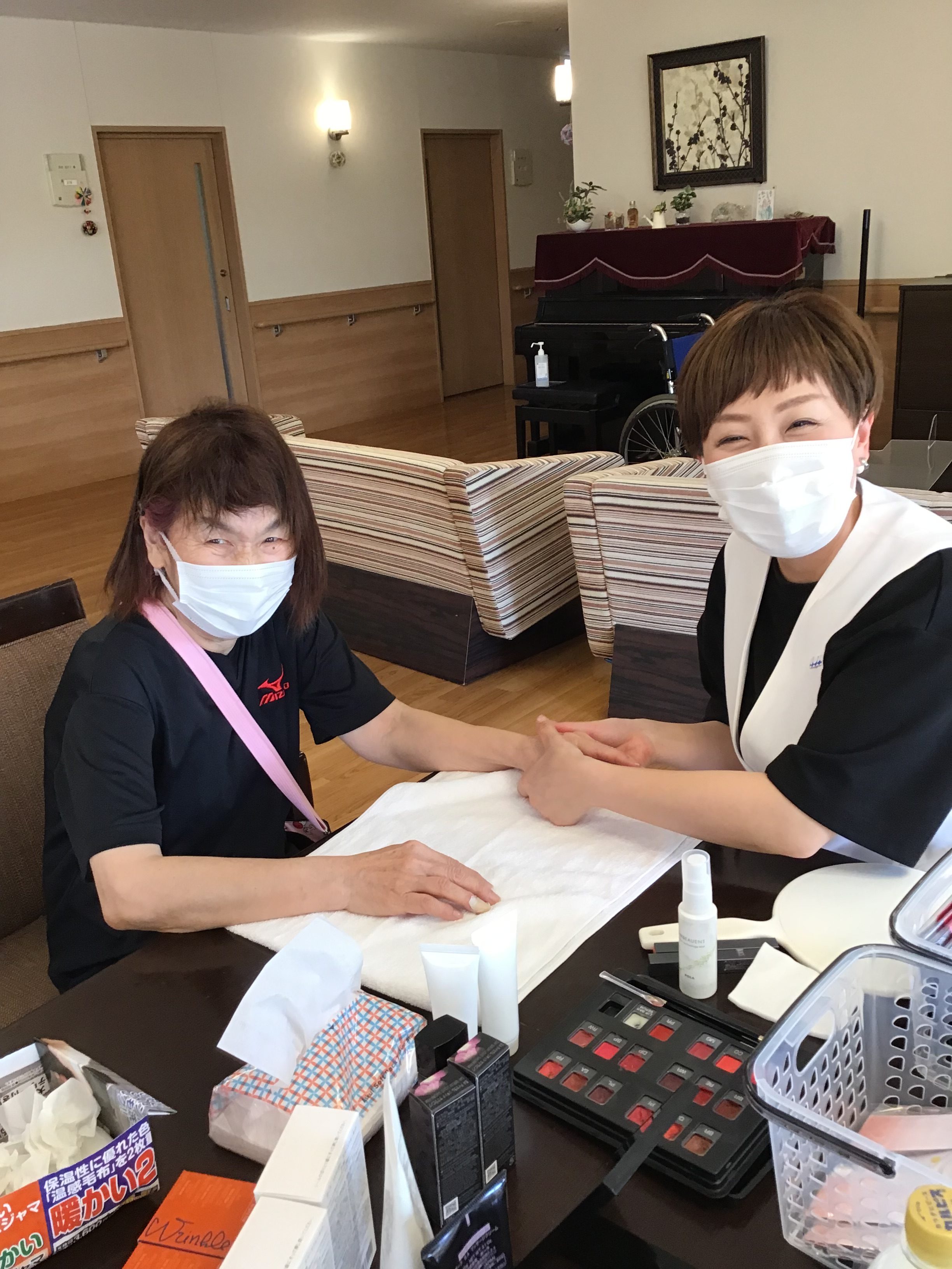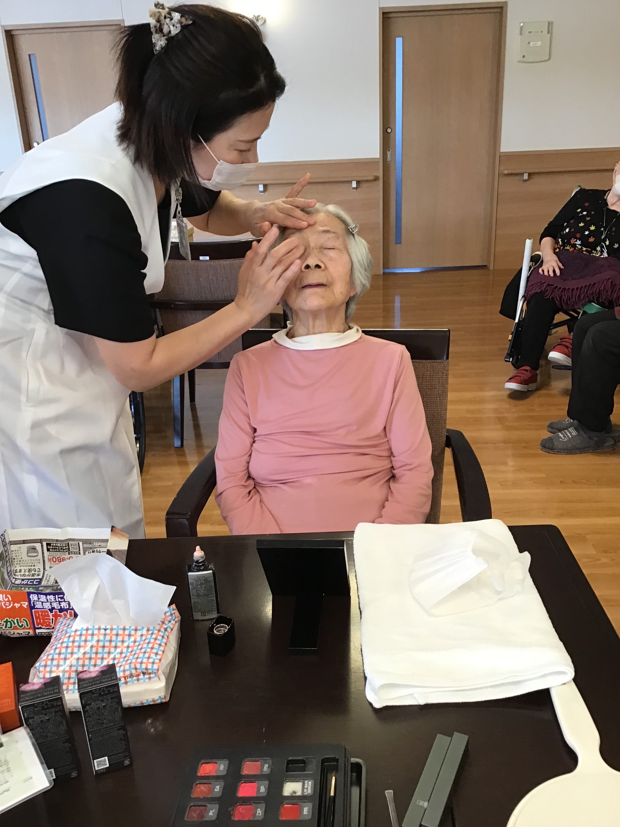引き続き今月もハンドマッサージをしていただいたのですが、今回は女性の入居者様に「お化粧」をしてくれました!