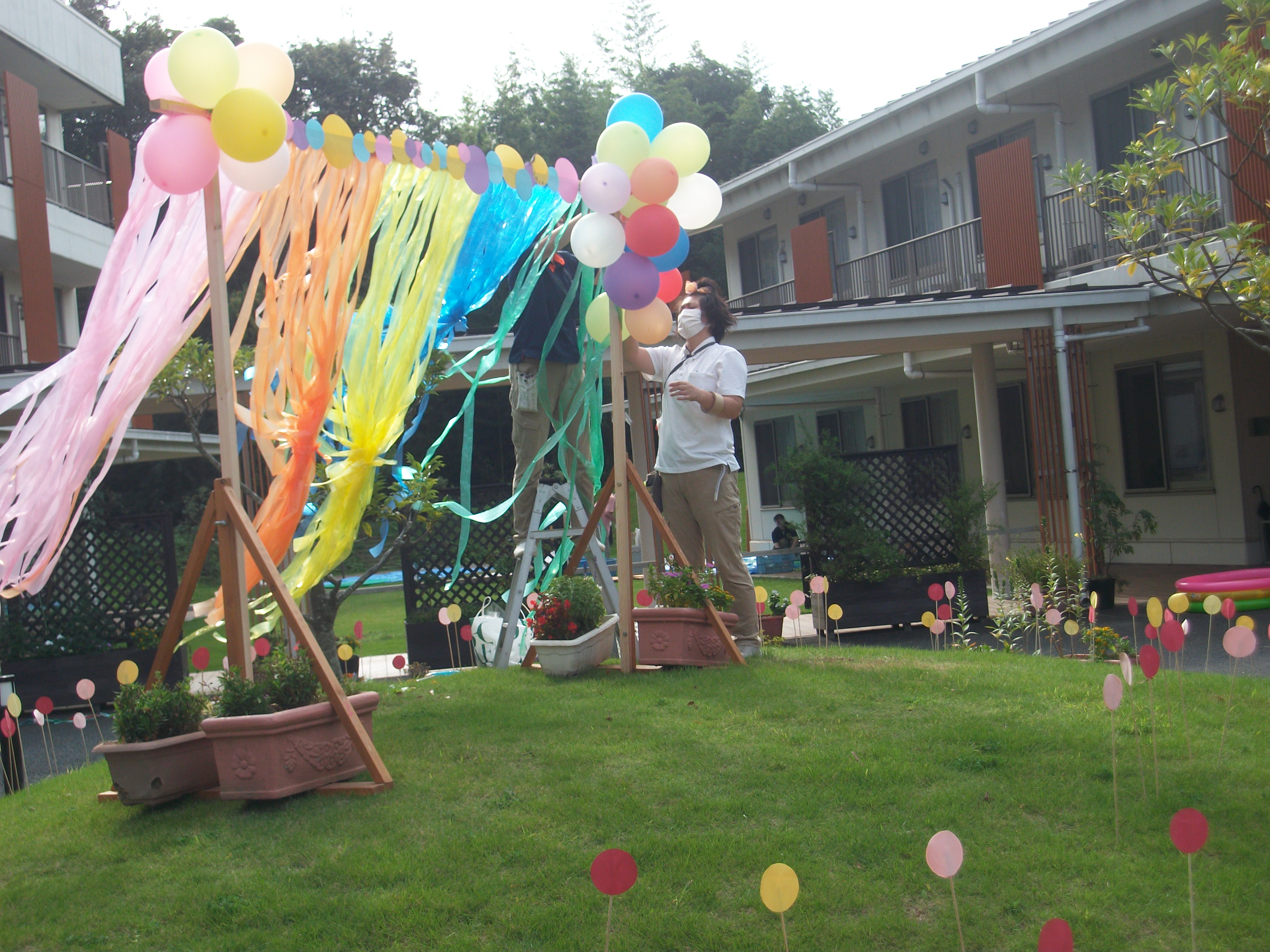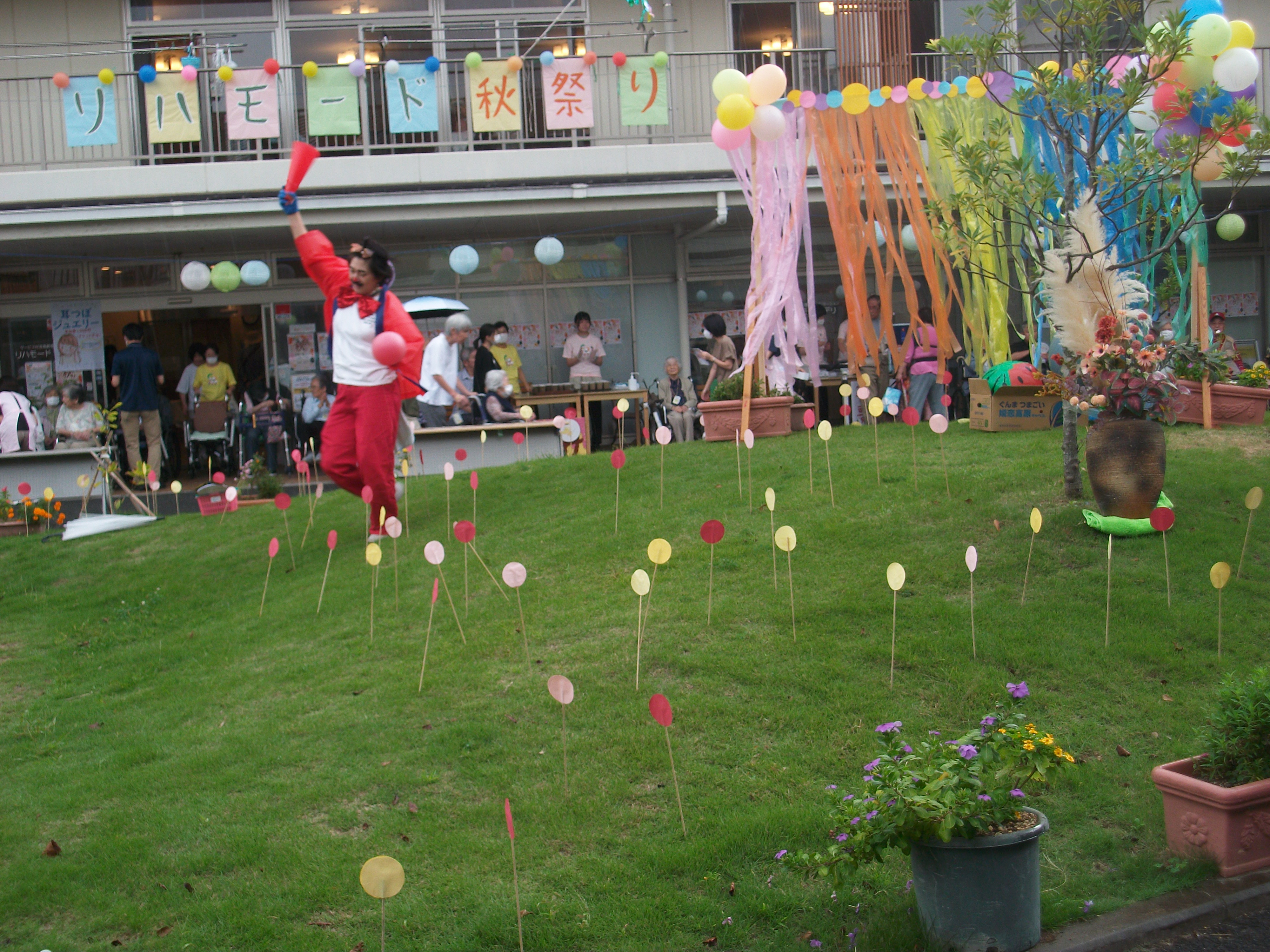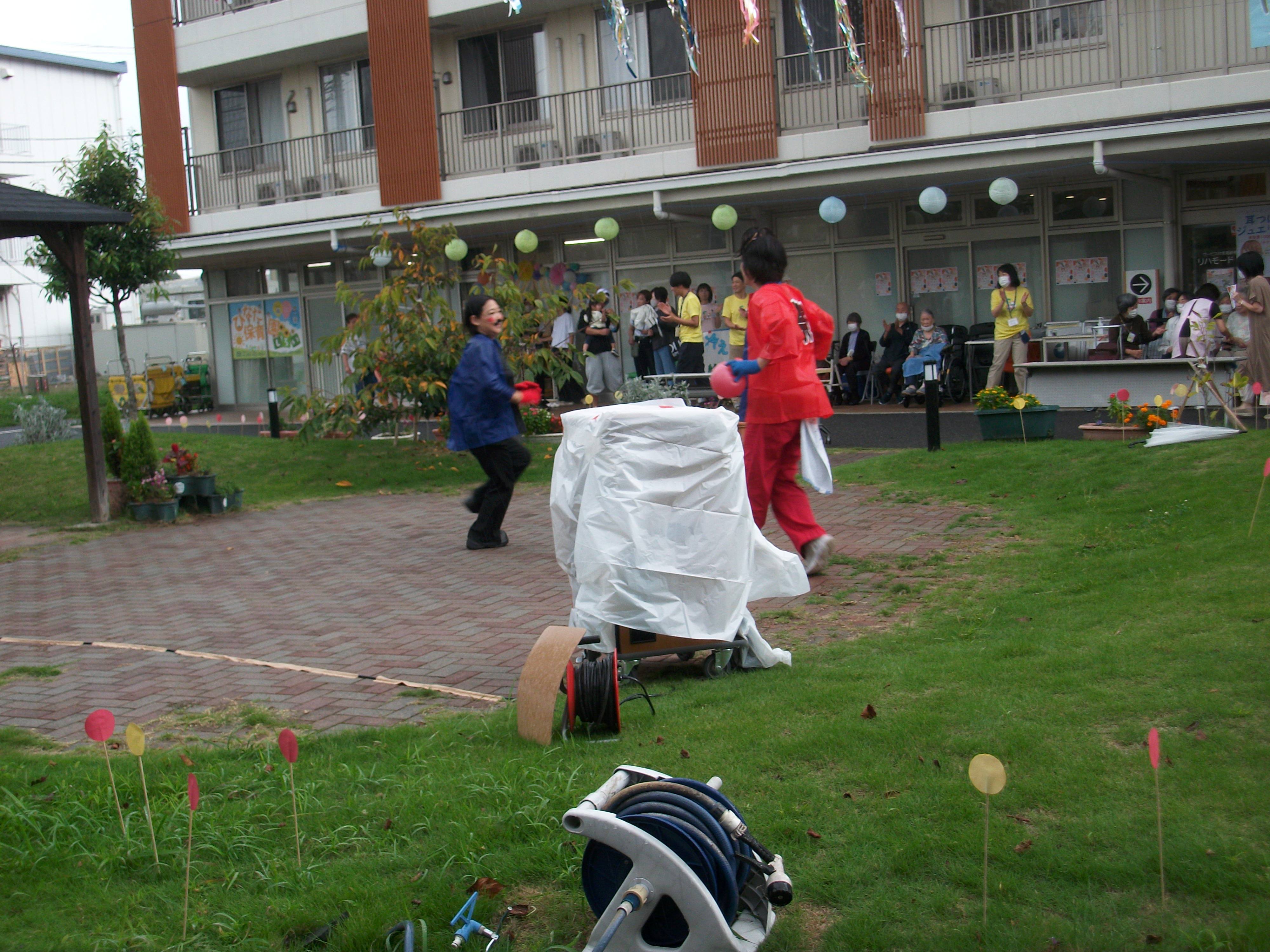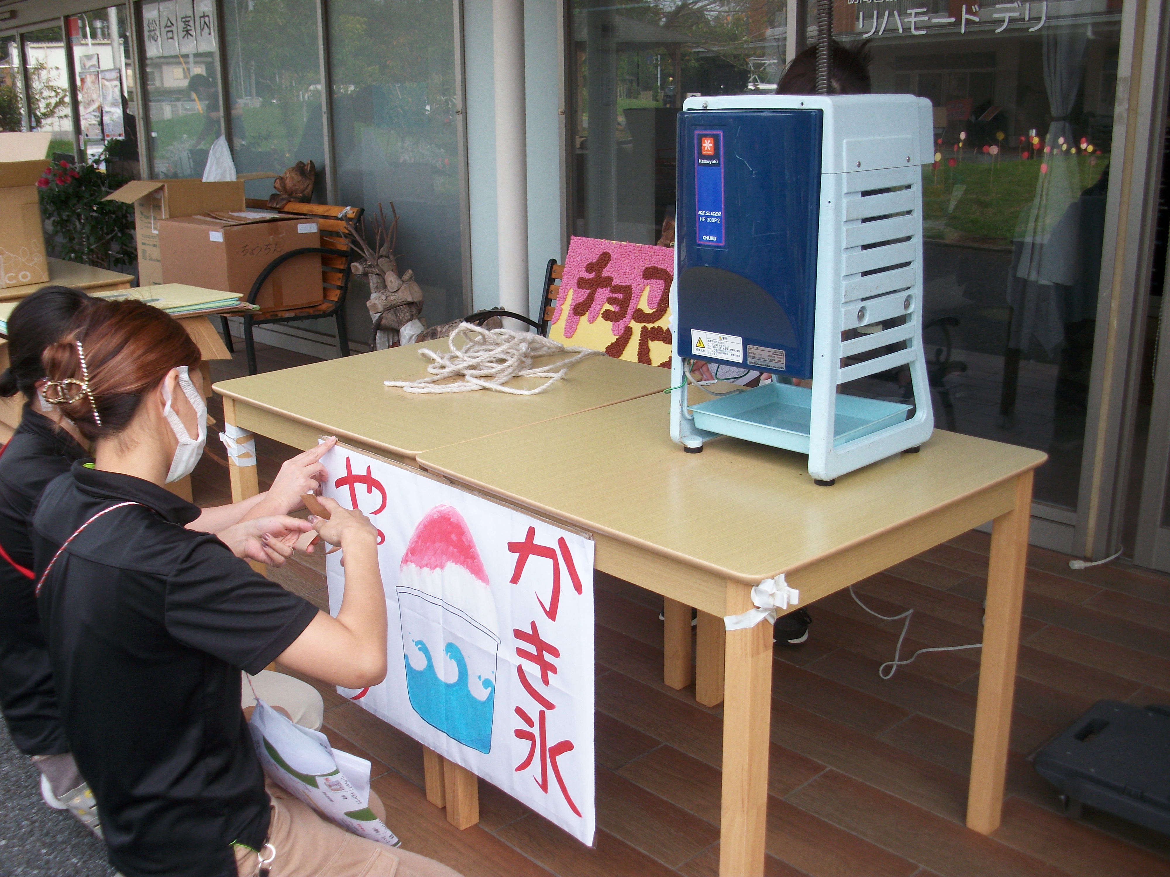お祭りが開催と同時に小雨がちらほら、スタッフは雨にも負けず「ヒゲダンス」を披露!