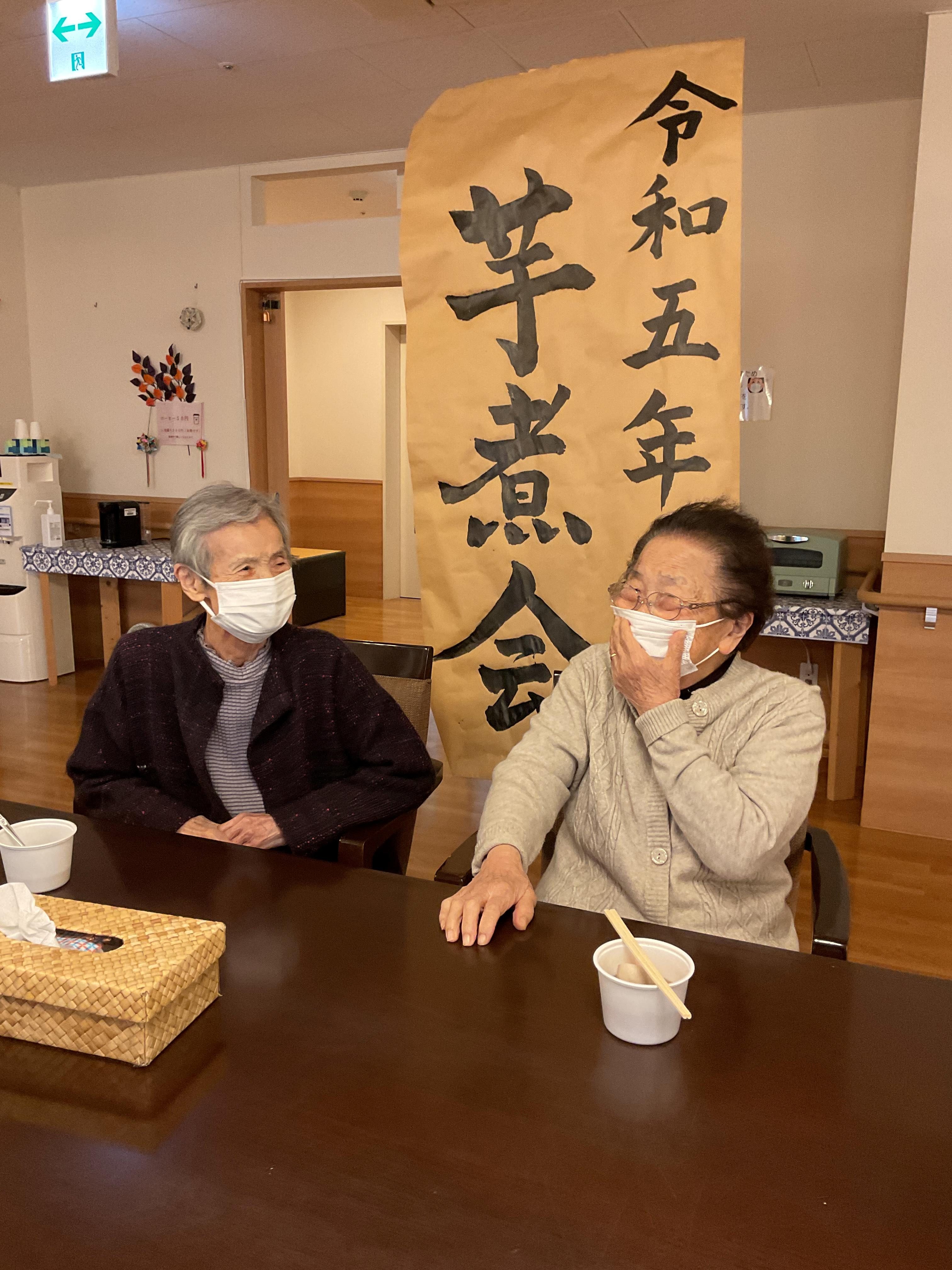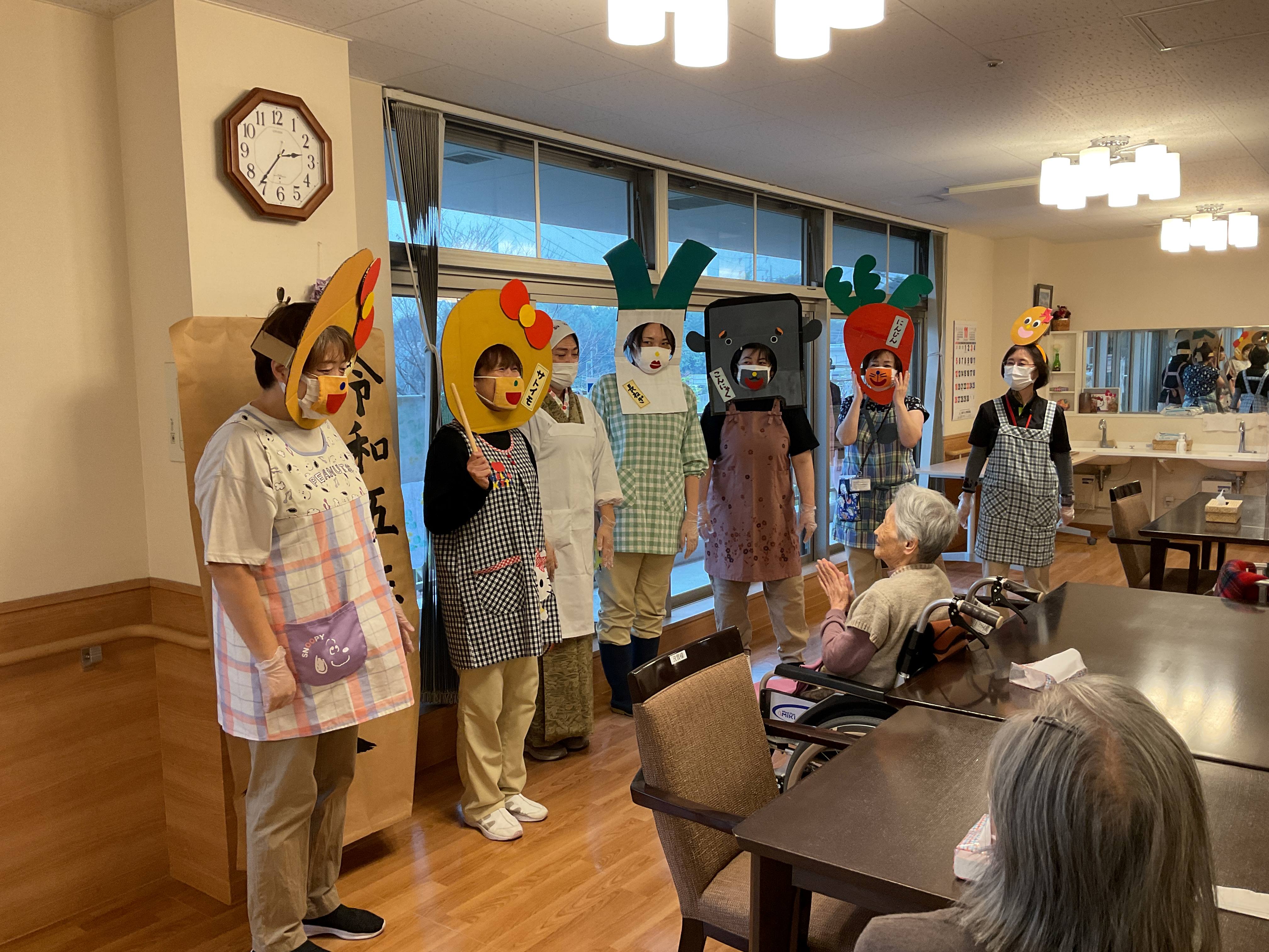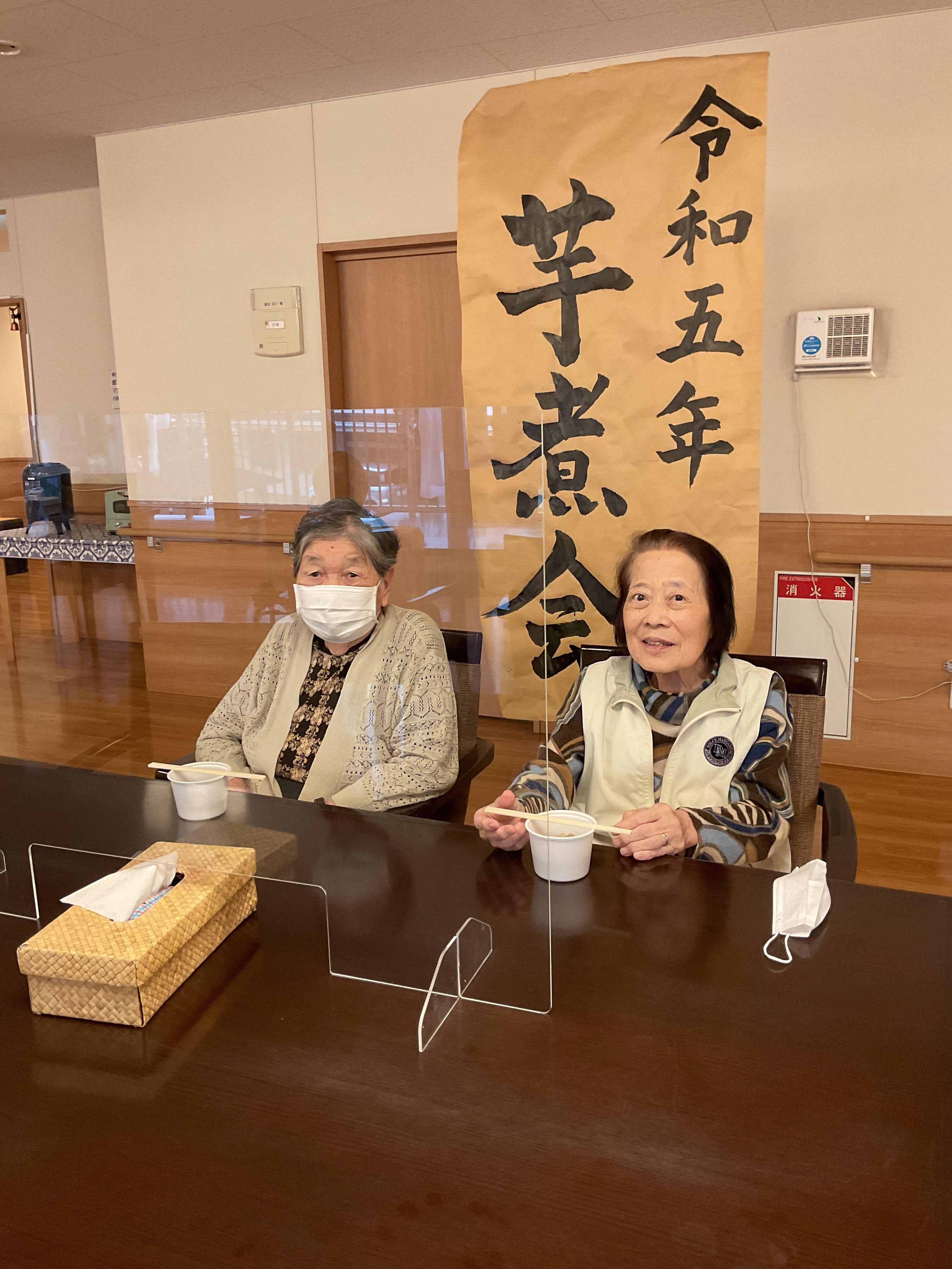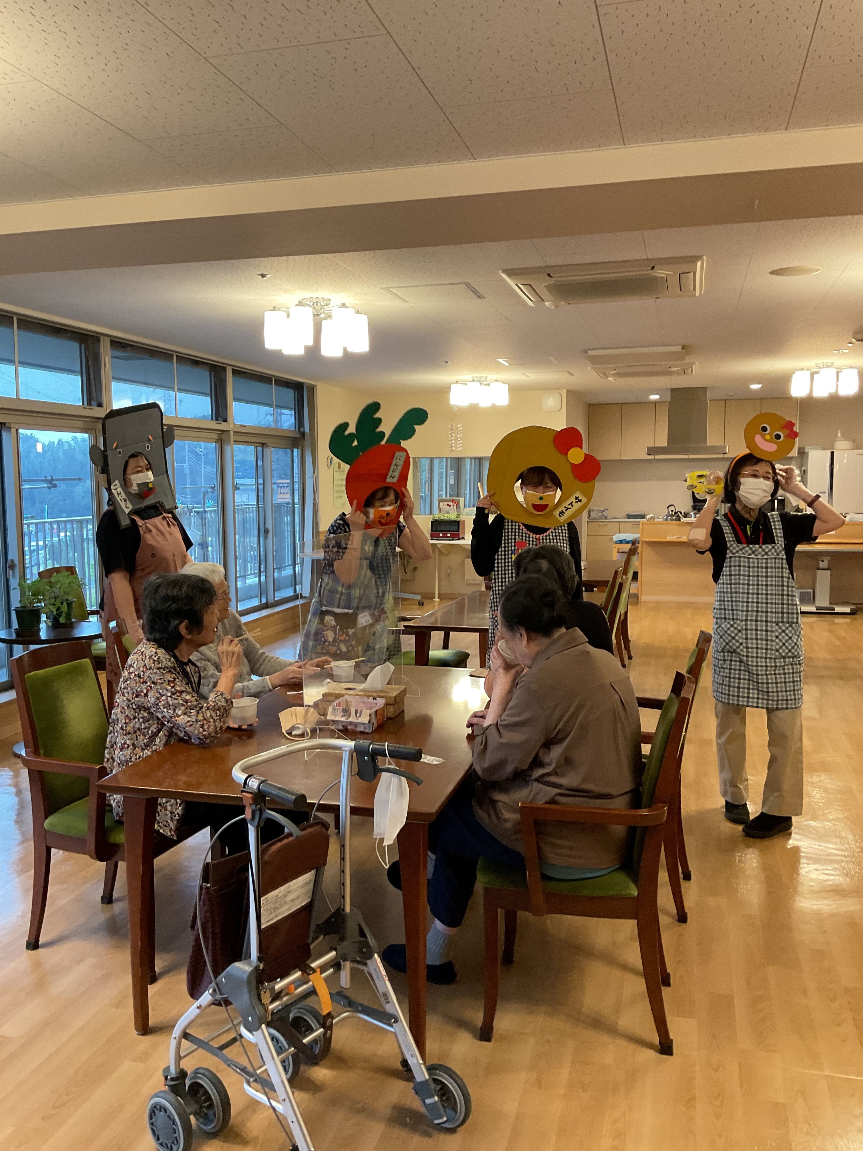 ちょっと寒くて外で芋煮会はできなかったのですが、スタッフ作成の被り物をかぶってみなさん楽しそうですね~