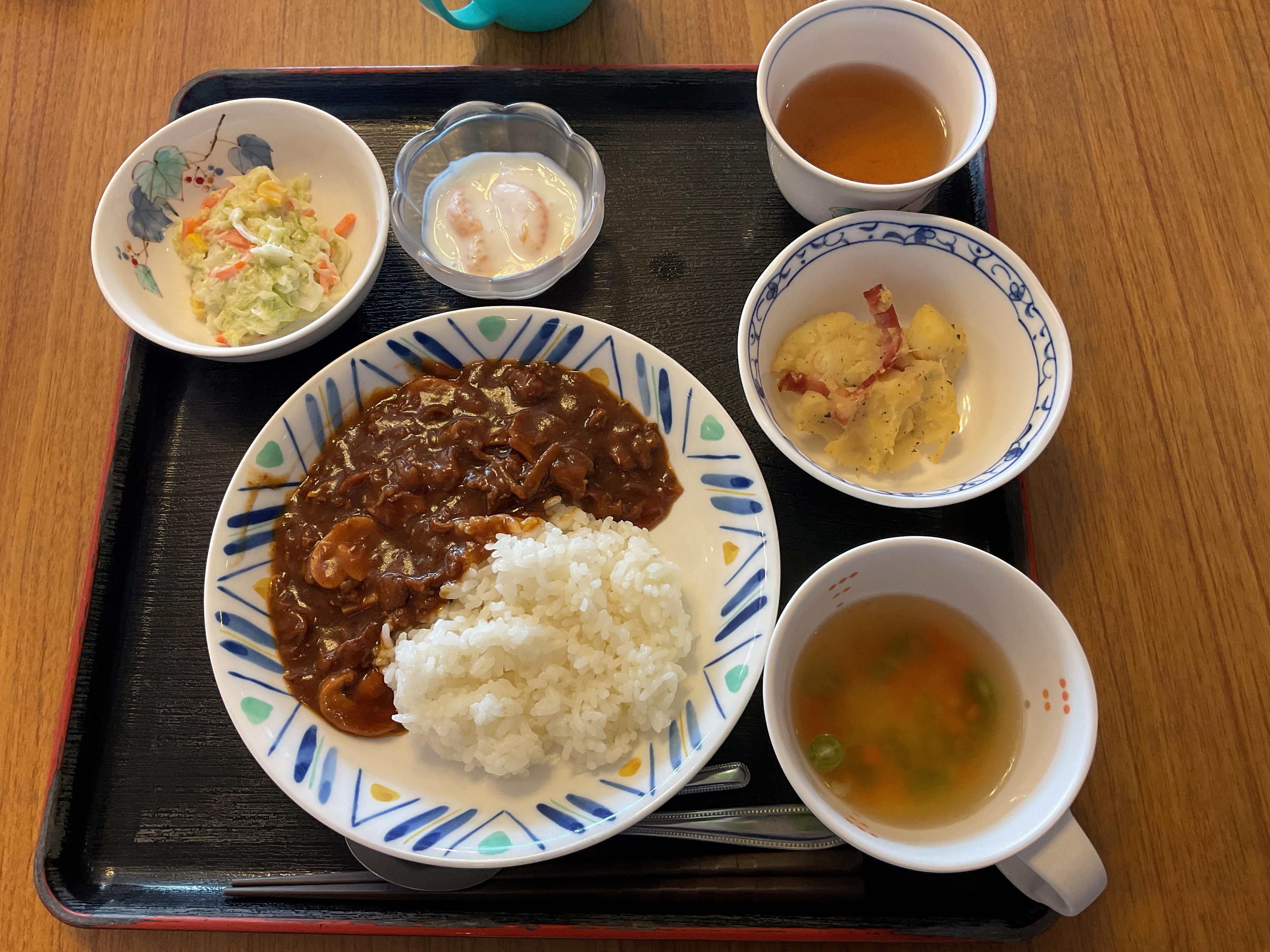 献立のメニューは、ハヤシライスとジャーマンポテト、コールスローとフルーツヨーグルトです!