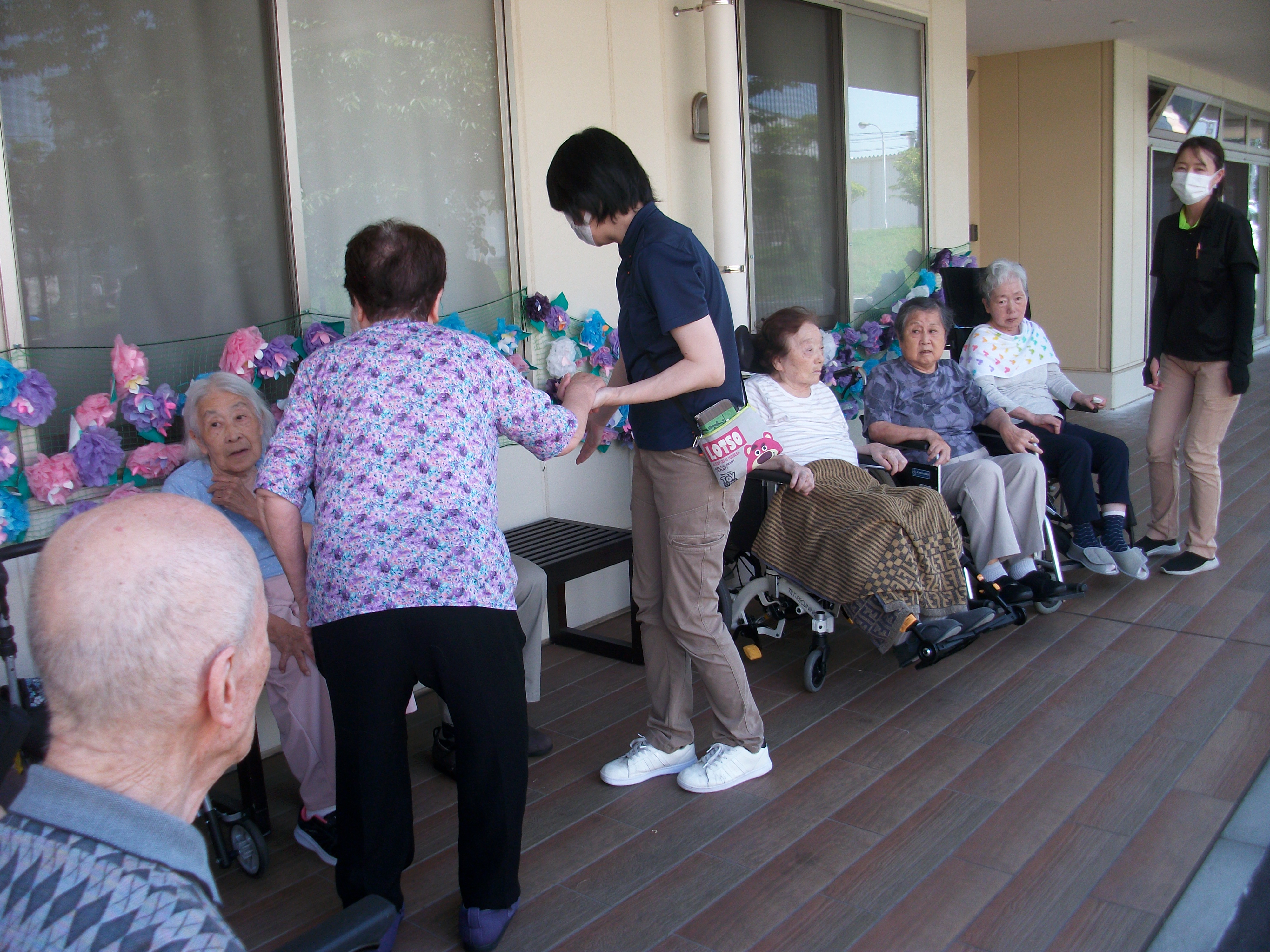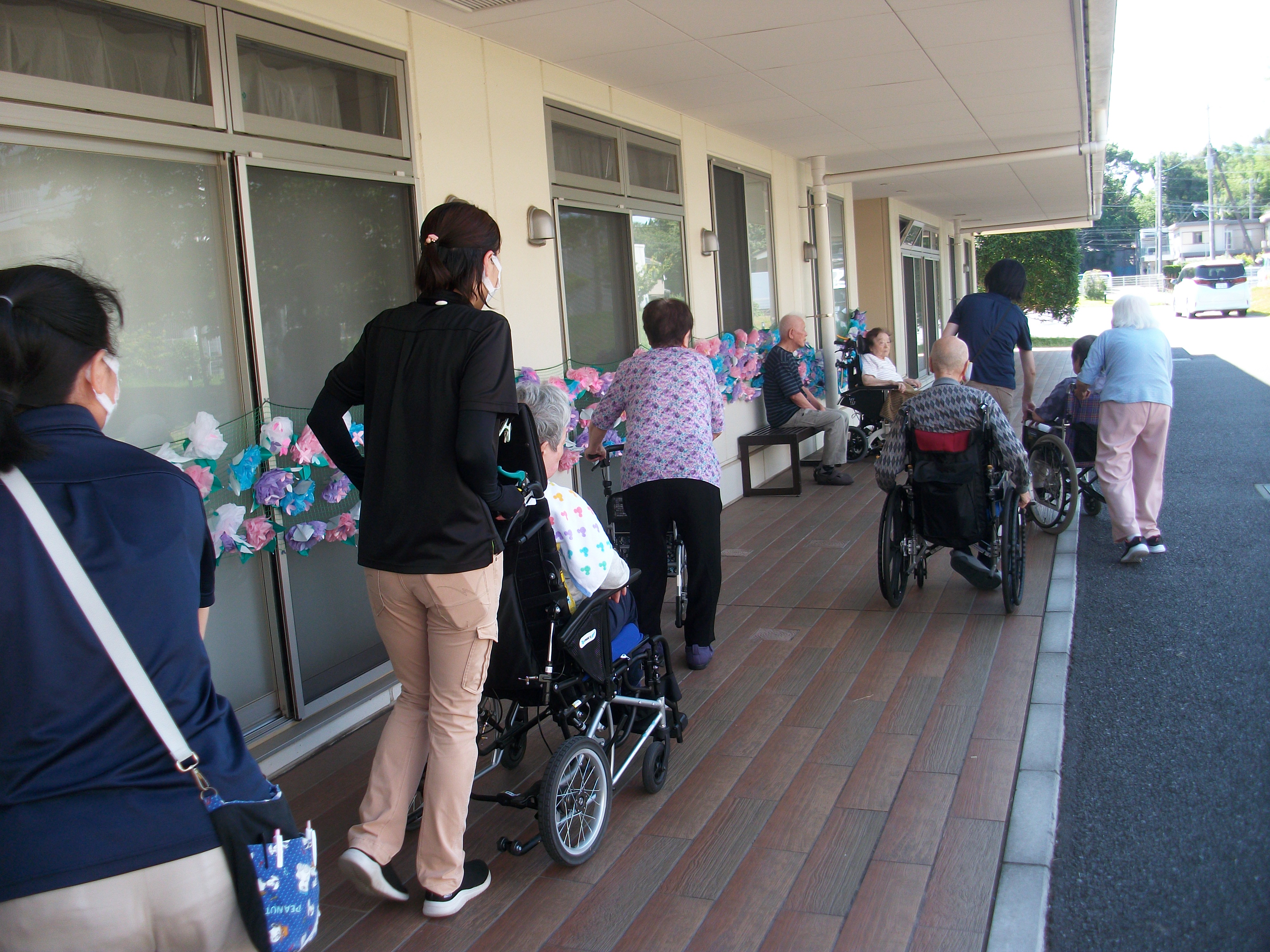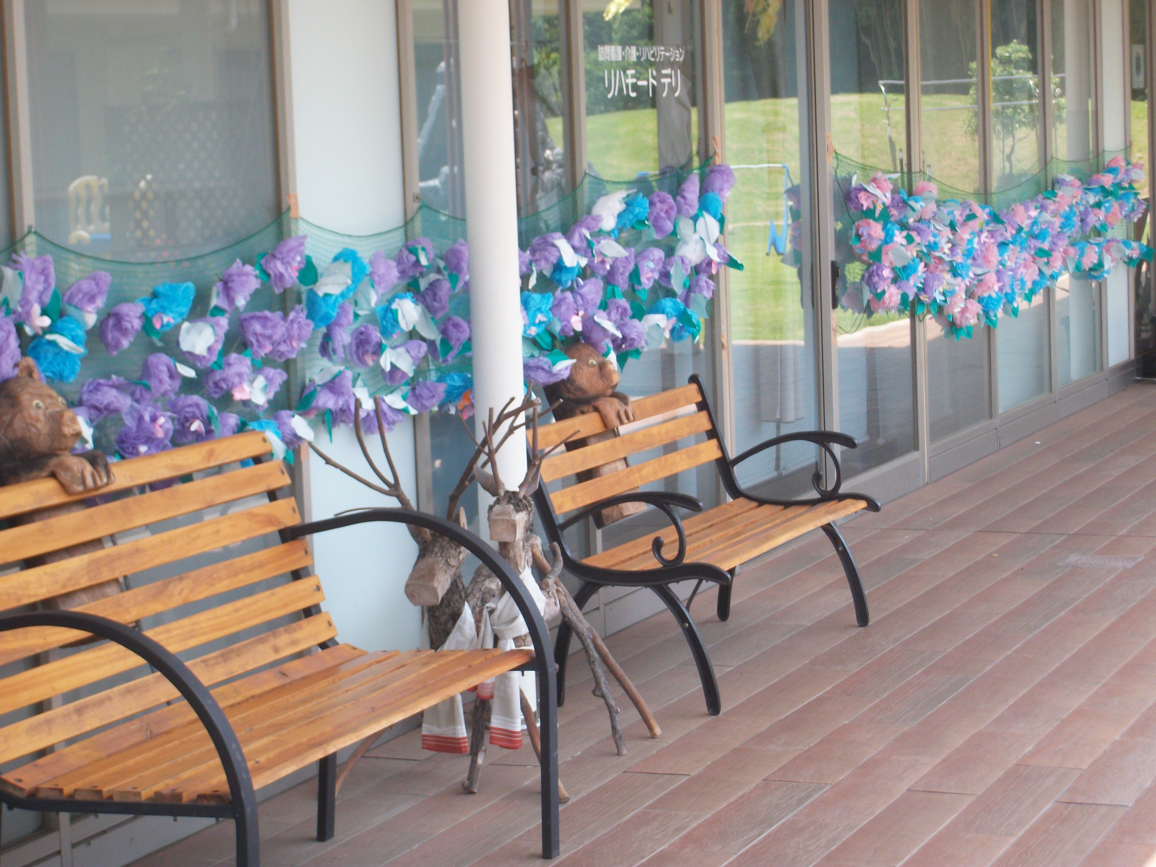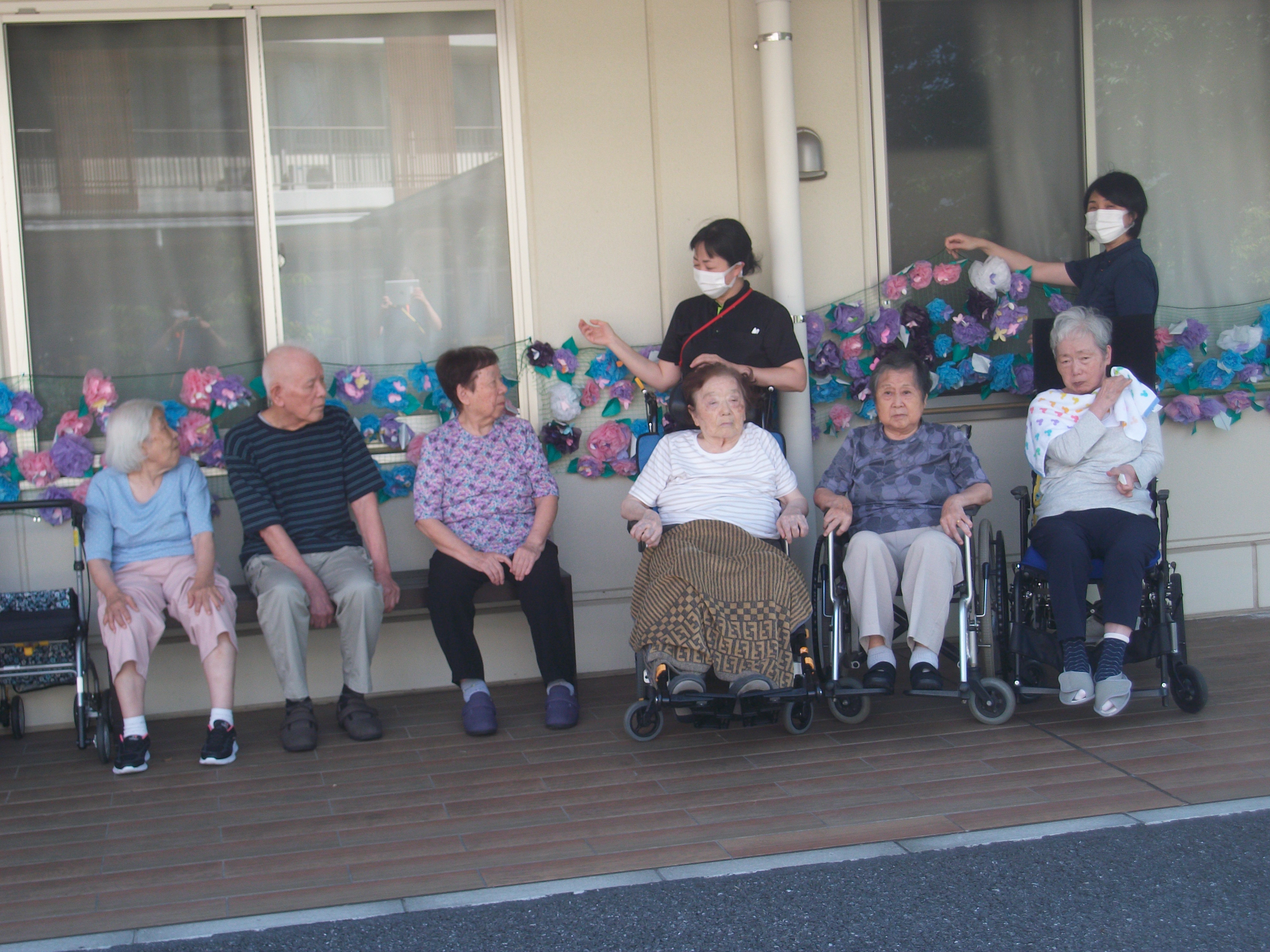 手作りの紫陽花ロードが施設の渡り廊下を飾っています。