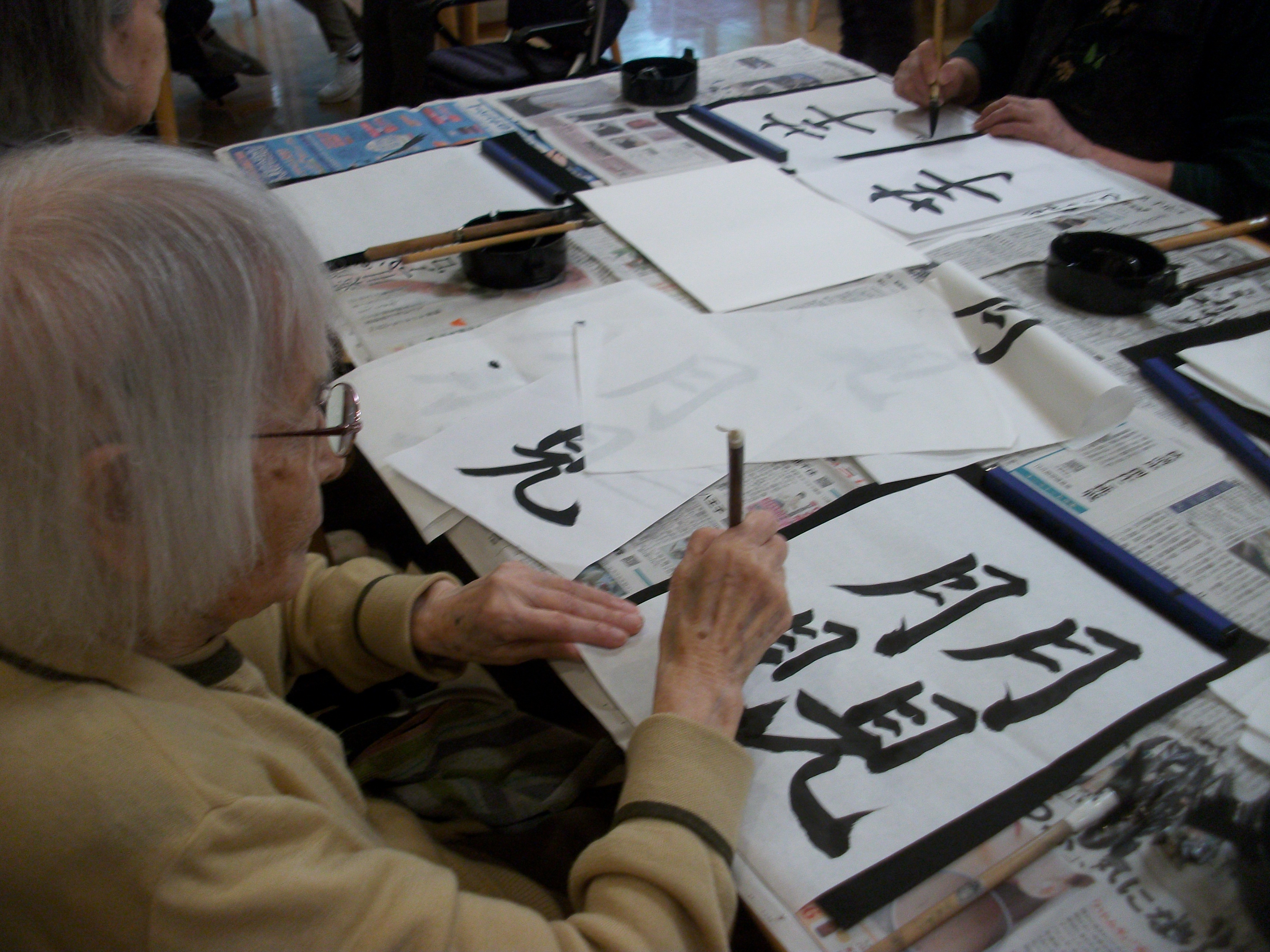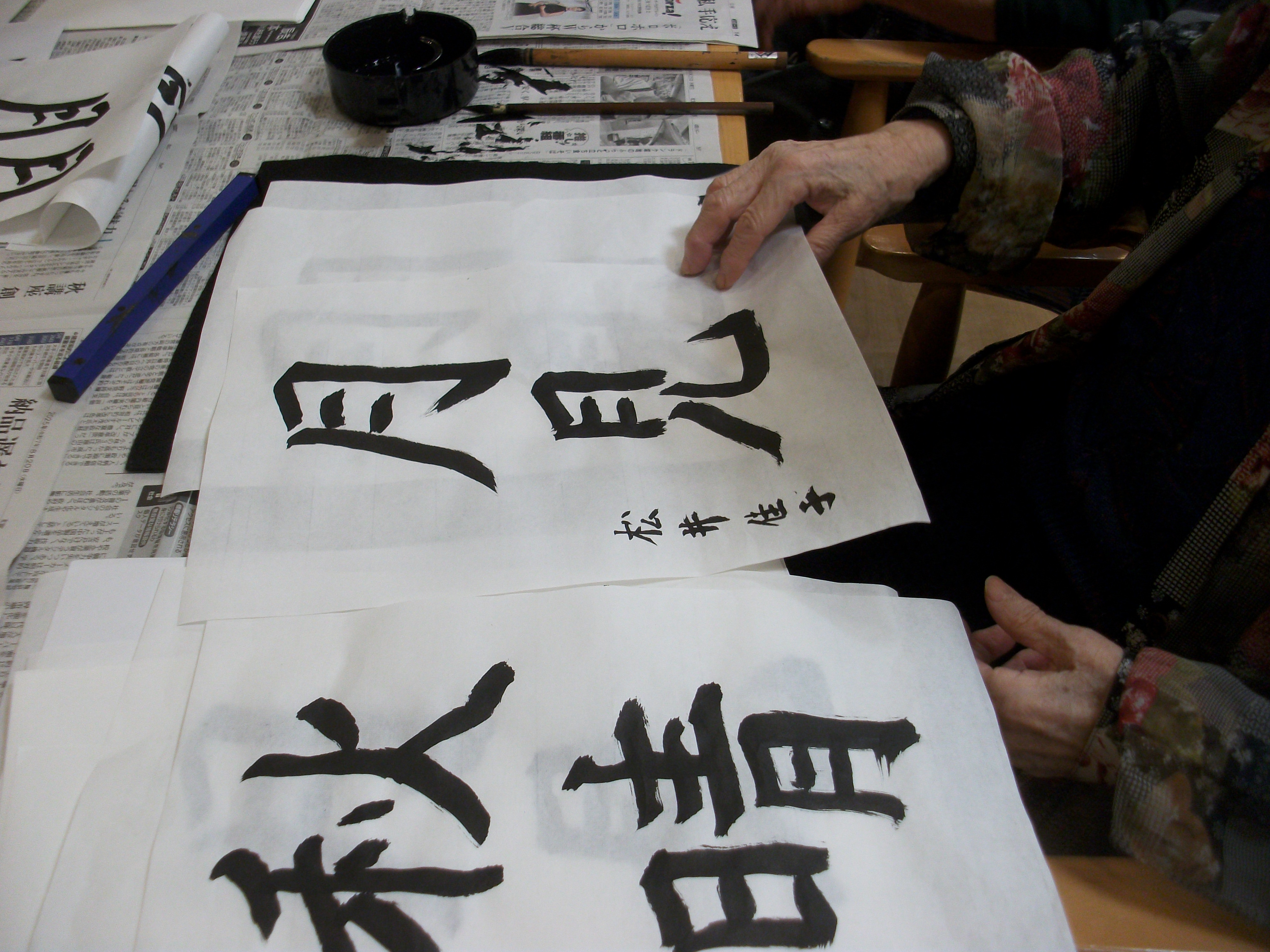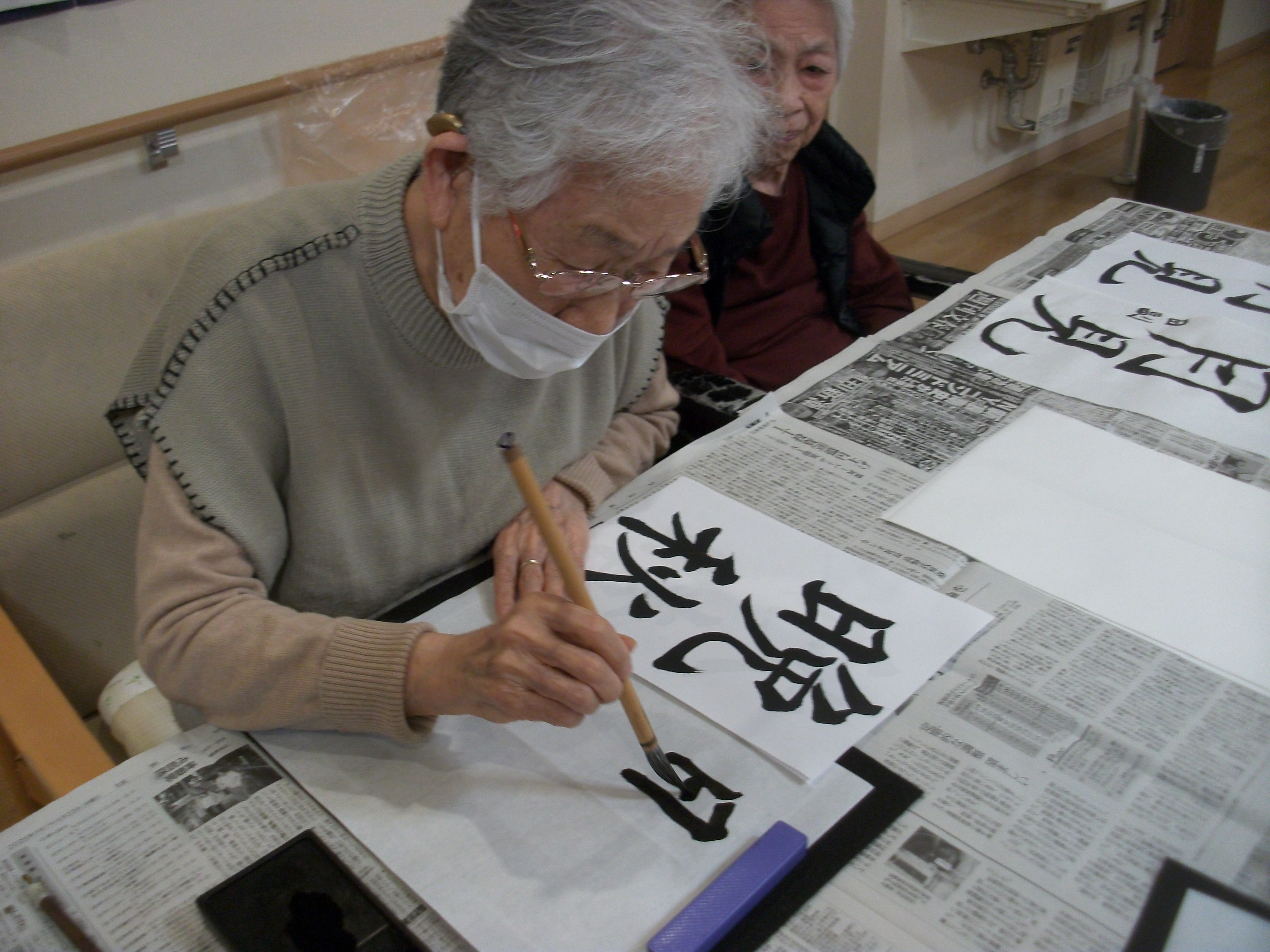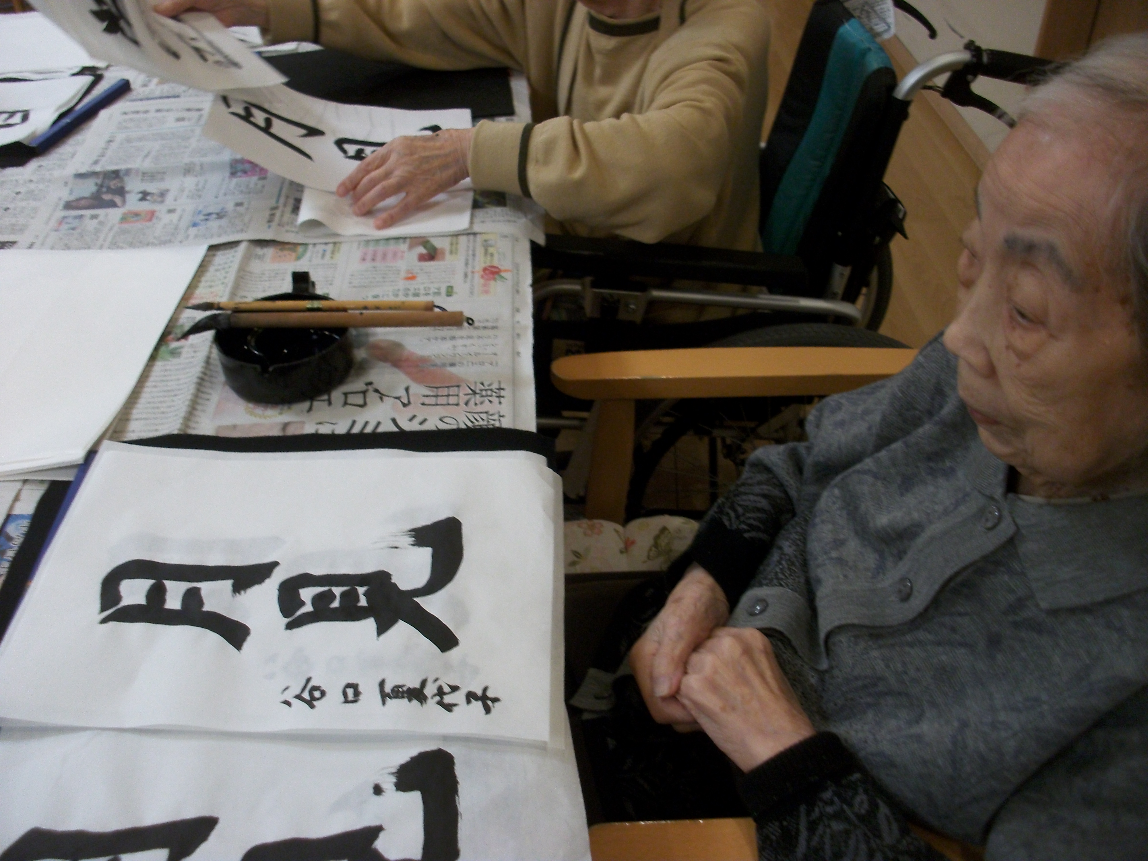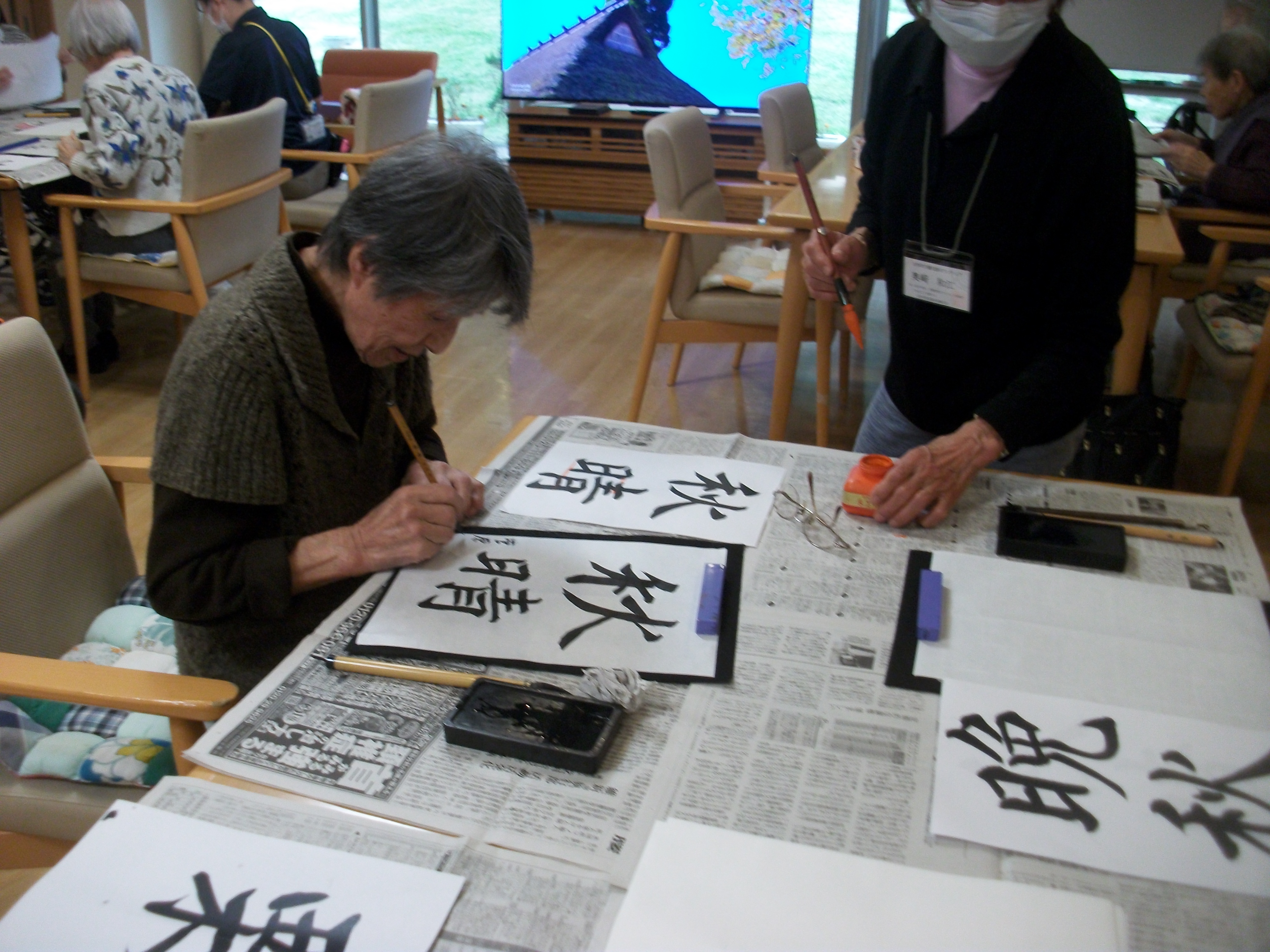 ケアに書道ボランティアの先生がきて、今回から合同でホーム・ヴィラの入居者様も一緒に参加です!