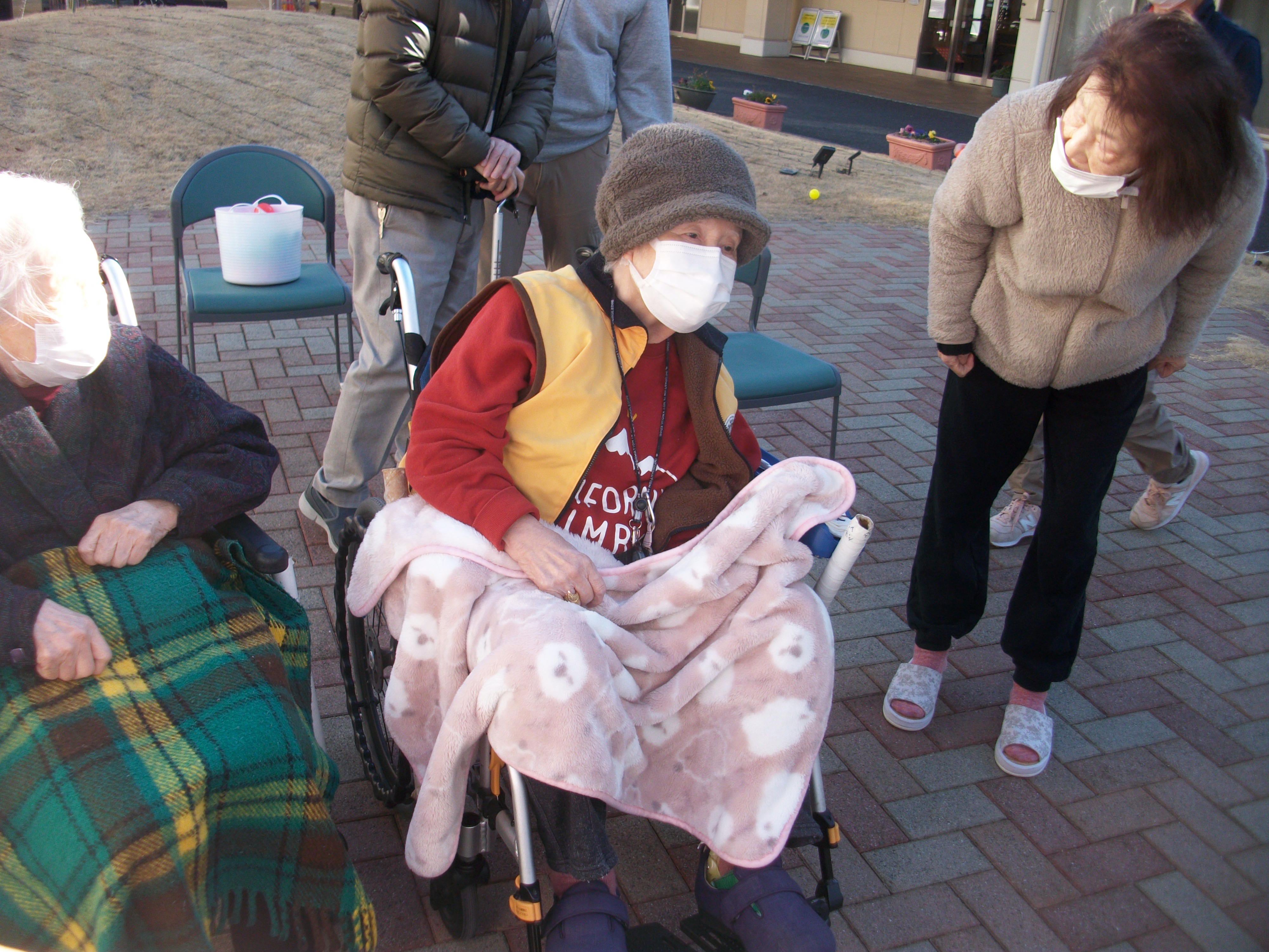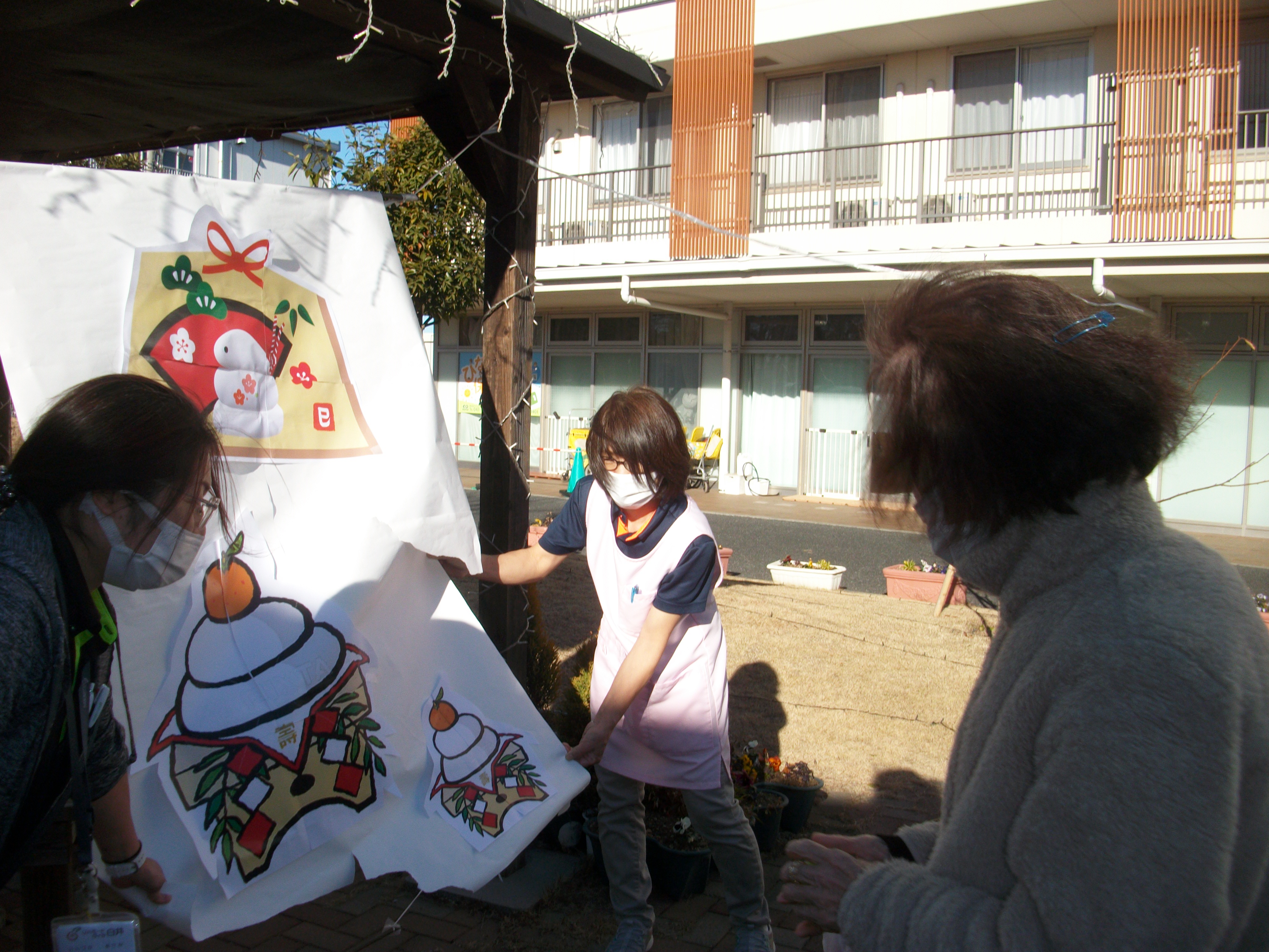 模造紙にはった鏡餅を的に、ボールを当てて鏡開きです!