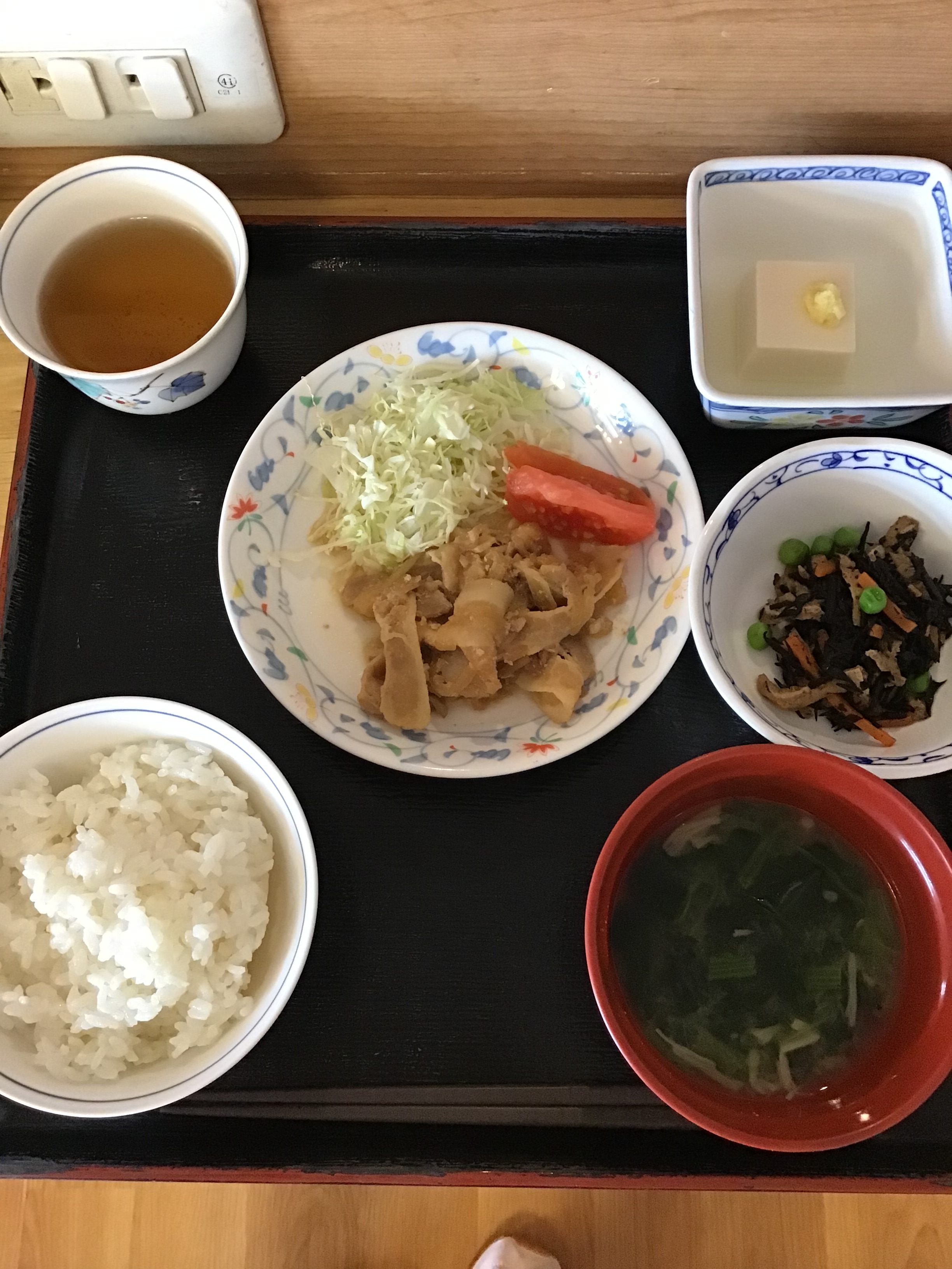 献立のメニューは、豚肉の生姜焼きとひじき煮、奴です。
