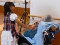 手遊び歌では子供たちと入居者様が一緒に手を合わせあって