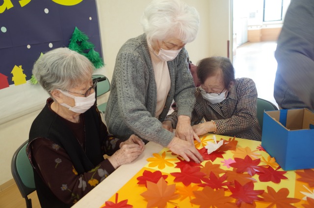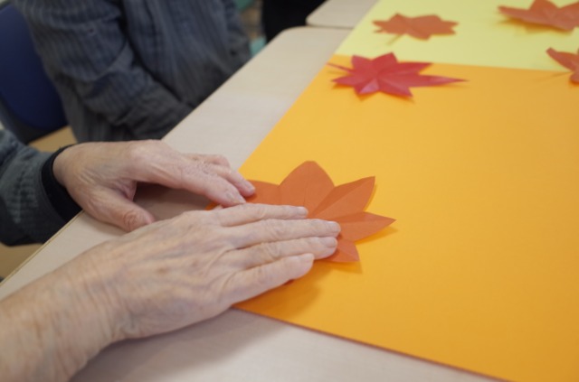 秋という事で、紅葉を題材としてもみじやイチョウの葉に切った折り紙を