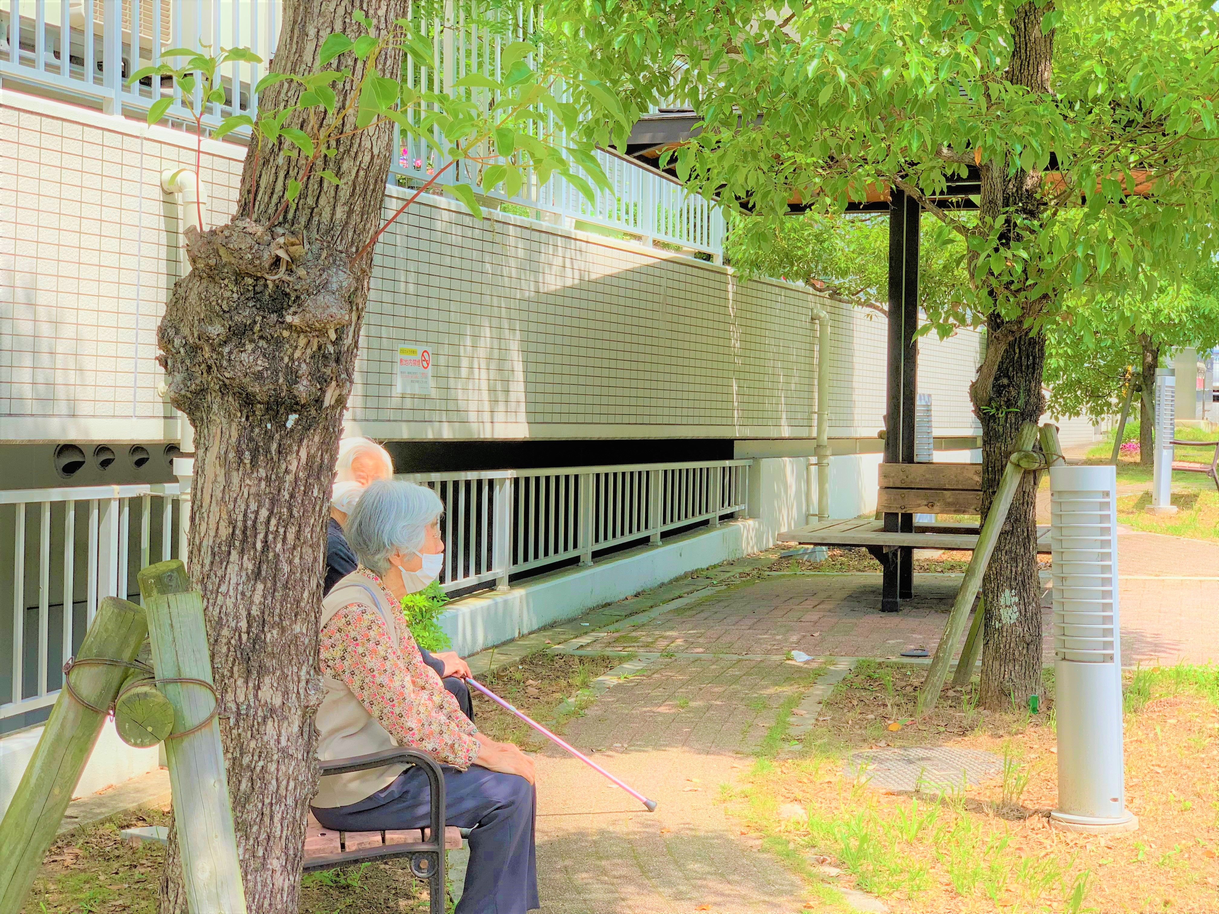 ベンチで新緑を眺めながら