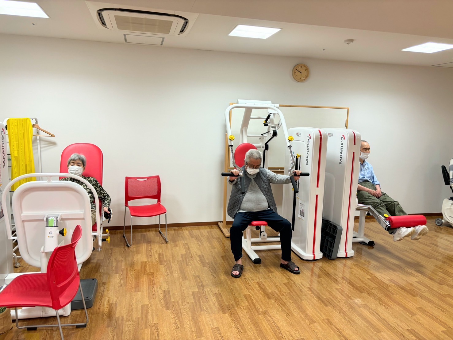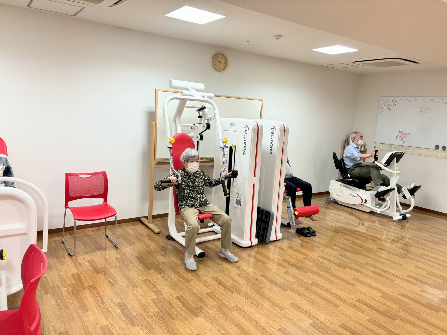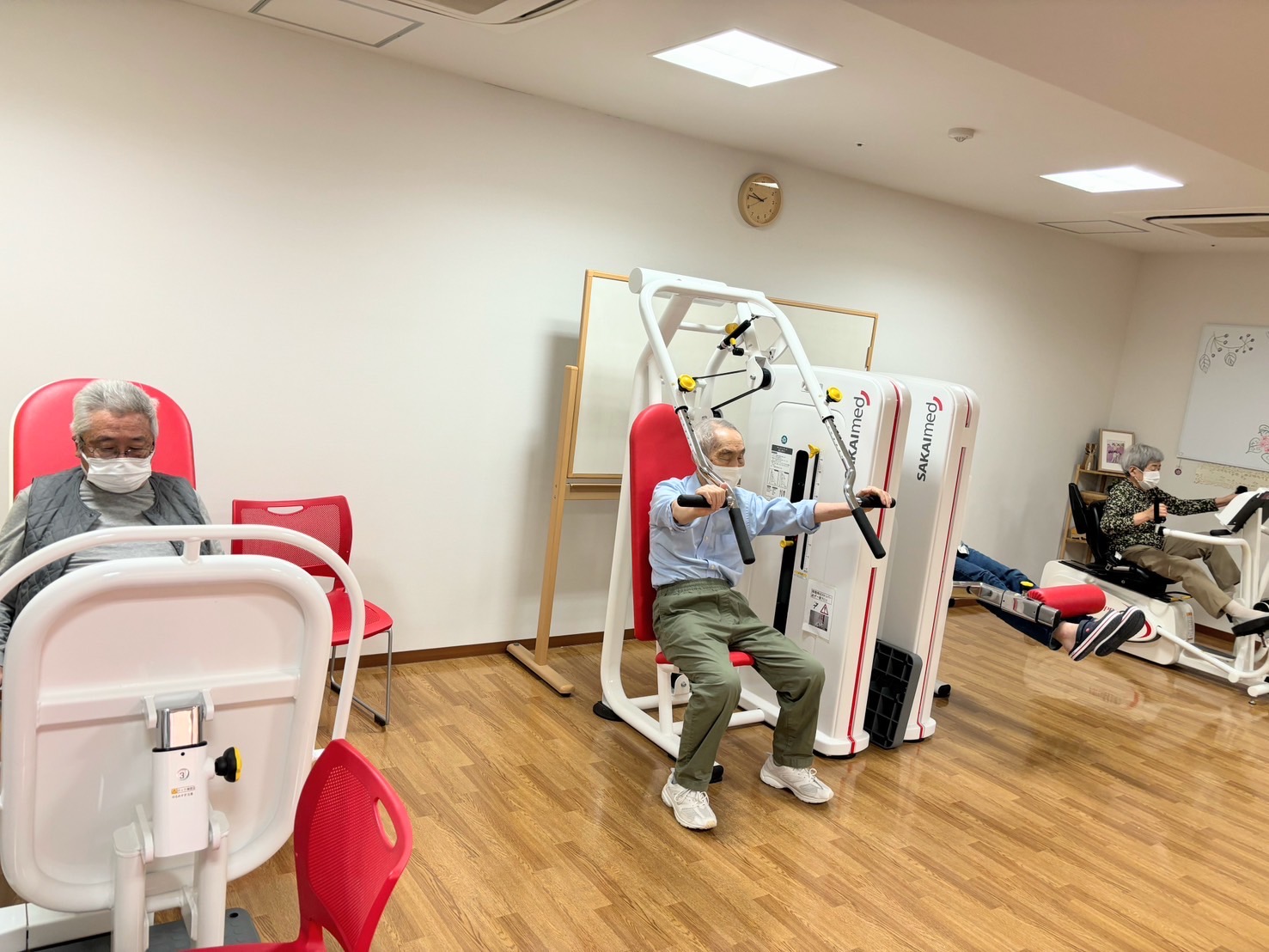 みなさん椅子に座ったままで、足を上げたり、手を伸ばしたり・・・