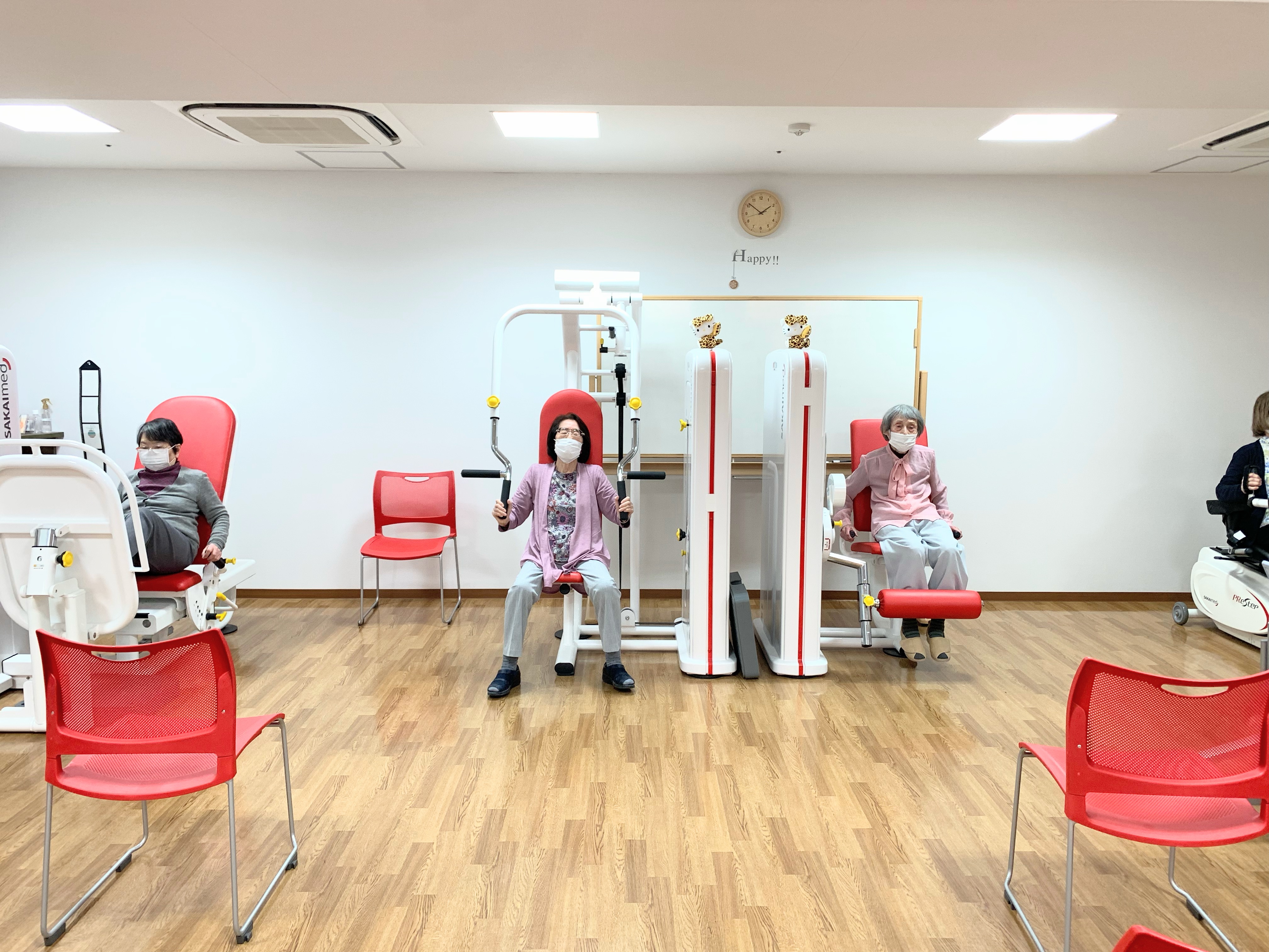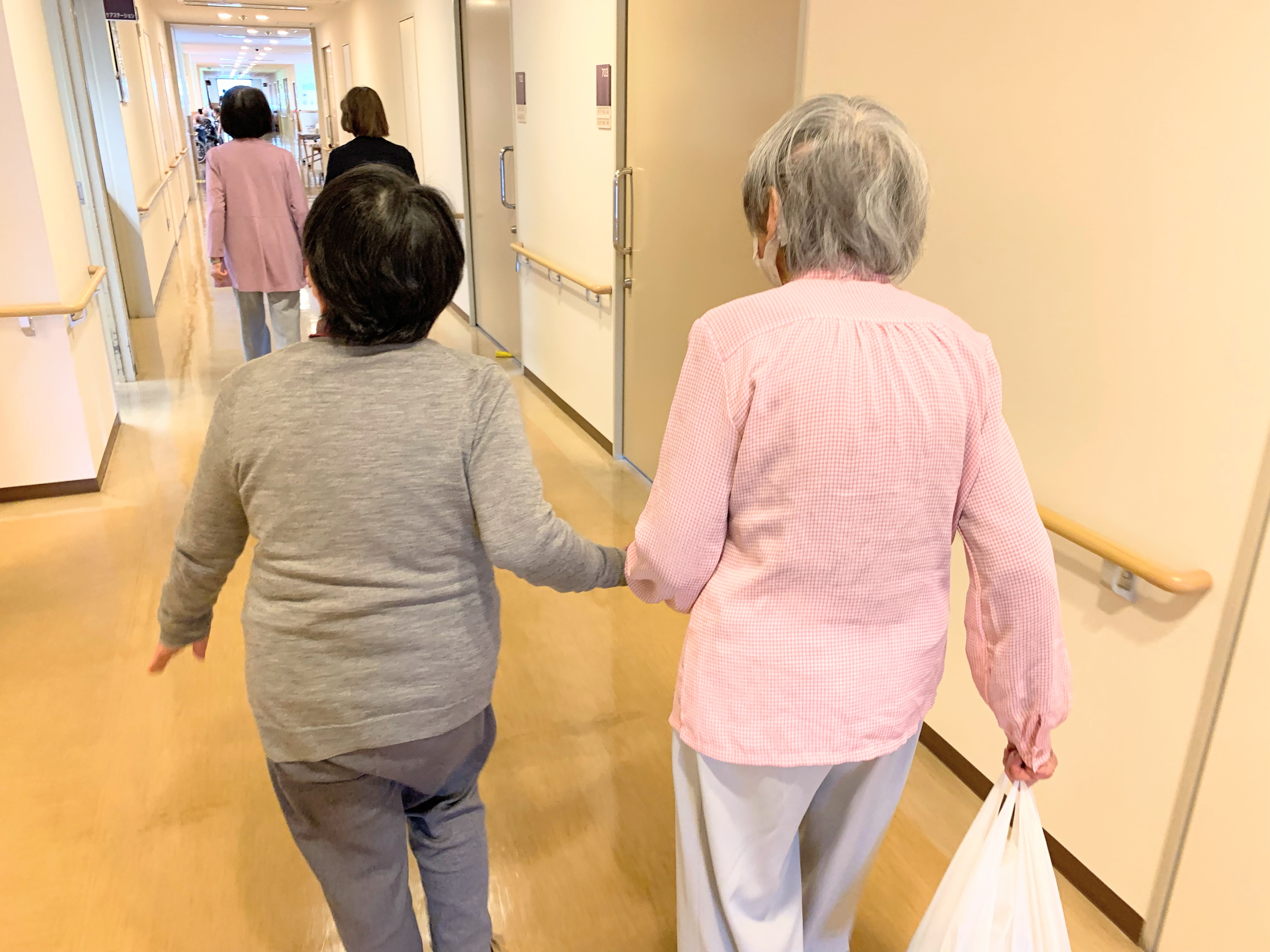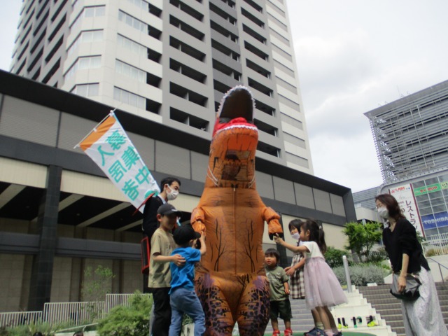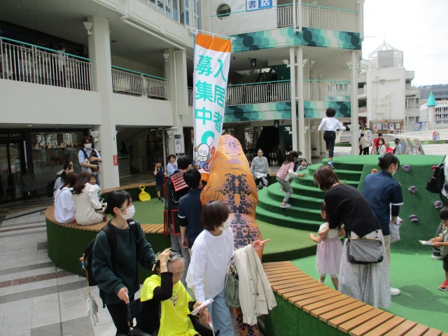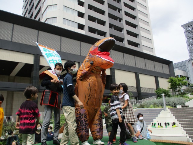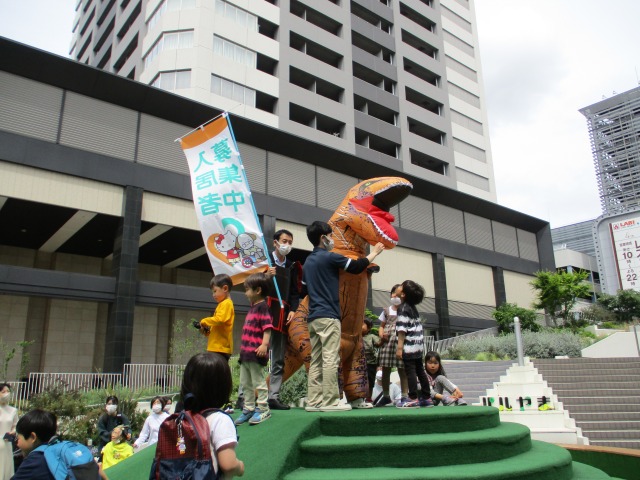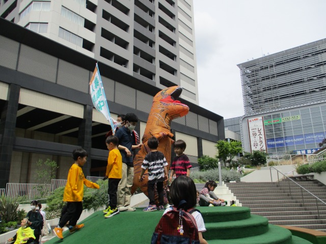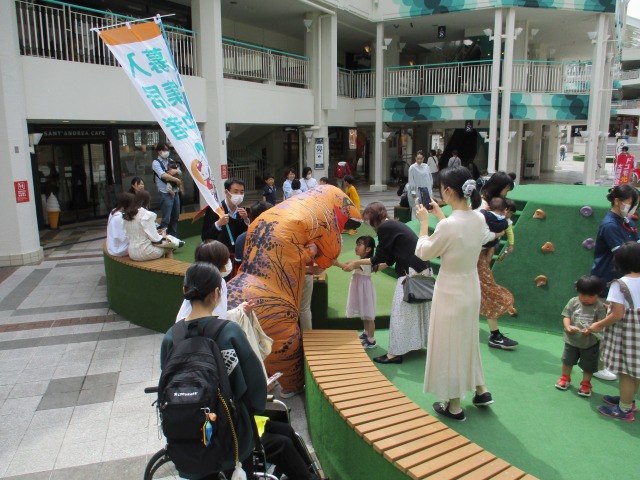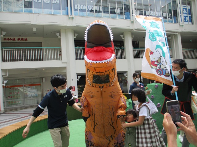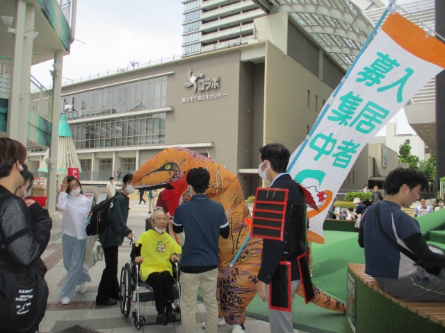 恐竜と一緒に、ご入居者様も「すごいねーっ」と