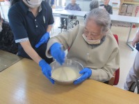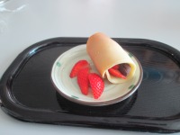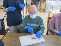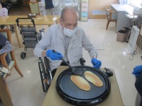 こんにちはデイサービスです。本日は料理教室ということで旬の苺を使って「苺のあんこ巻き」を作りました(^^♪ まず、ホットケーキミックスに水と卵を入れてよく混ぜ生地を作ります。それをホットプレートで小判型に薄く焼き、丸めたあんこ玉とカットした苺を包んでくるくると巻いたら出来上がり! みなさまにはそれぞれ分担して作業を行っていただき、男性陣にはホットプレートで生地を焼く作業をお願いしました(^^♪ あんこをころころと丸めるのに苦戦せれる方もおりましたが、みなさま本当に手際よく美味しそうに仕上げてくださいました(^▽^)/ 早速おやつで召し上がっていただきましたが、苺の甘酸っぱい香りが漂い、みなさま笑顔で「美味しいよ-」と仰っていました! 本日の料理教室も大成功でした\(^_^)/