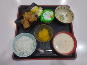 ご飯に温かいクラムチャウダー、ジューシーな唐揚げ、やさしい味わいのタラモサラダ、フルーツ、ヨーグルトとバランスの良い献立です。