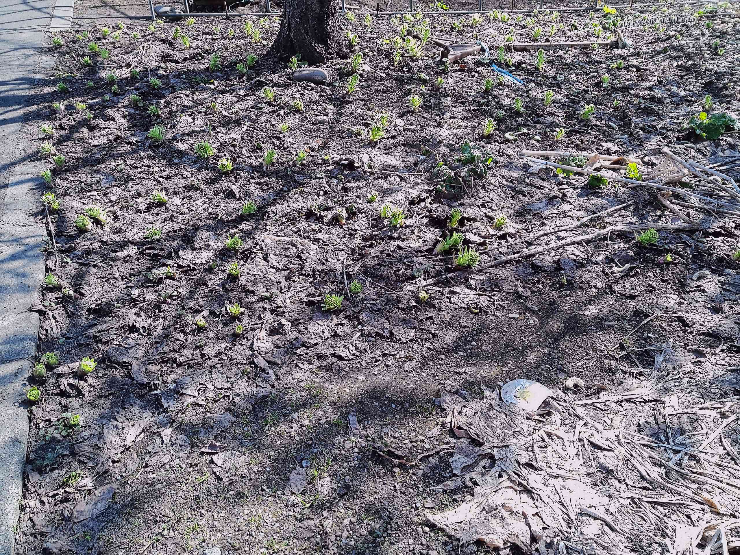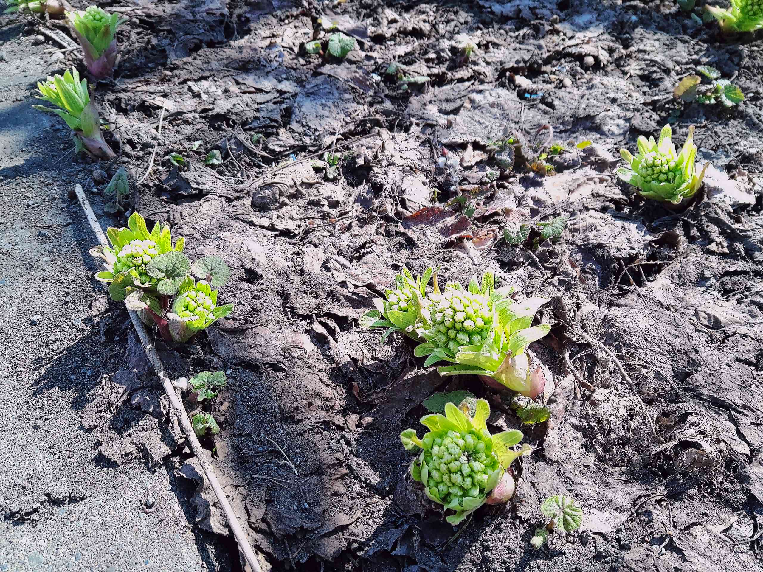 施設で夏野菜やお花などを栽培している畑の隣に、ふきのとうがたくさん芽を出しているのを発見しました。