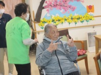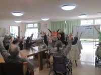 こんにちはデイサービスです。今日のレクは、久しぶりの笑いヨガです。講師の先生が来てくださり皆様と大きな声で発声したり、大きな声で笑ったり(^O^)。「やったー!やったー!いえ~」と言いながら両手を上にバンザーイ☺ その後にあはははは!と大笑いをするというものです。皆様、講師の先生に圧倒されて目をまん丸にされておりました(笑) でも普段中々大きな声で笑ったりすることがないと思うので、いいストレス発散になったと思います(*^^)v