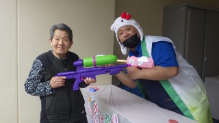 水鉄砲でコップ飛ばしゲームでは皆さん