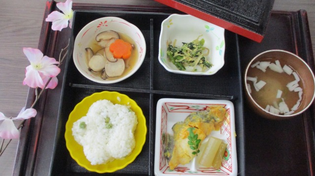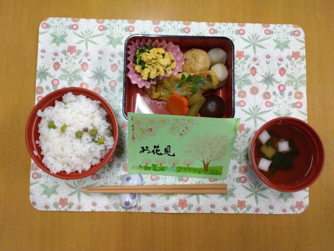 昼食がなんとお花見御膳でした。煮物、魚、炒り卵