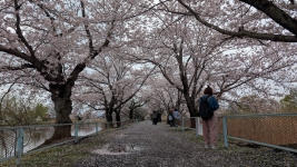溜池の中央に人が通れる道があり、その道の左右に桜の木が植えてあるので、桜が咲くと桜のトンネルの中を歩くことが出来ます。