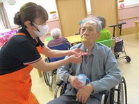 治療だけでなく、口腔ケアや口腔体操もおこなっています。その他、入れ歯の調整とかもあり、調整中の時は歯医者さんの指示で食事形態を夕食から変更する場合もあります。急な変更でも厨房さんも対応してくれて治ったら元の食事形態に戻しています。
