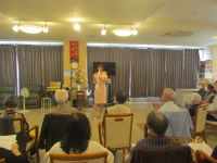 今日は、慰問レクの日です。今日の慰問の方は、皆様お待ちかねの「ゆーこりん」です。とっても可愛らしくてキュートできれいな方です。皆様が待ち望んでいるのもわかります。「情熱大陸♪」から始まり「涙そうそう」ユーミンの「やさしさに包まれたなら」・・前半最後の「天城越え」は皆様歌詞が分かると見えて歌われていました。ゆーこりんとのふれあいタイムでは、写真を撮ったり、思い思いのお話をしたりと・和気あいあいと時間が流れました。後半は「残酷な天使のテーゼ」で盛り上がり、最後のアンコール曲では松田聖子さんの「赤いスイートピー」を、ゆーこりんが歌を唄い締めくくられました。とても盛り上がり、時にはしっとりと聴き、良い時間が流れたレクの時間となりました。