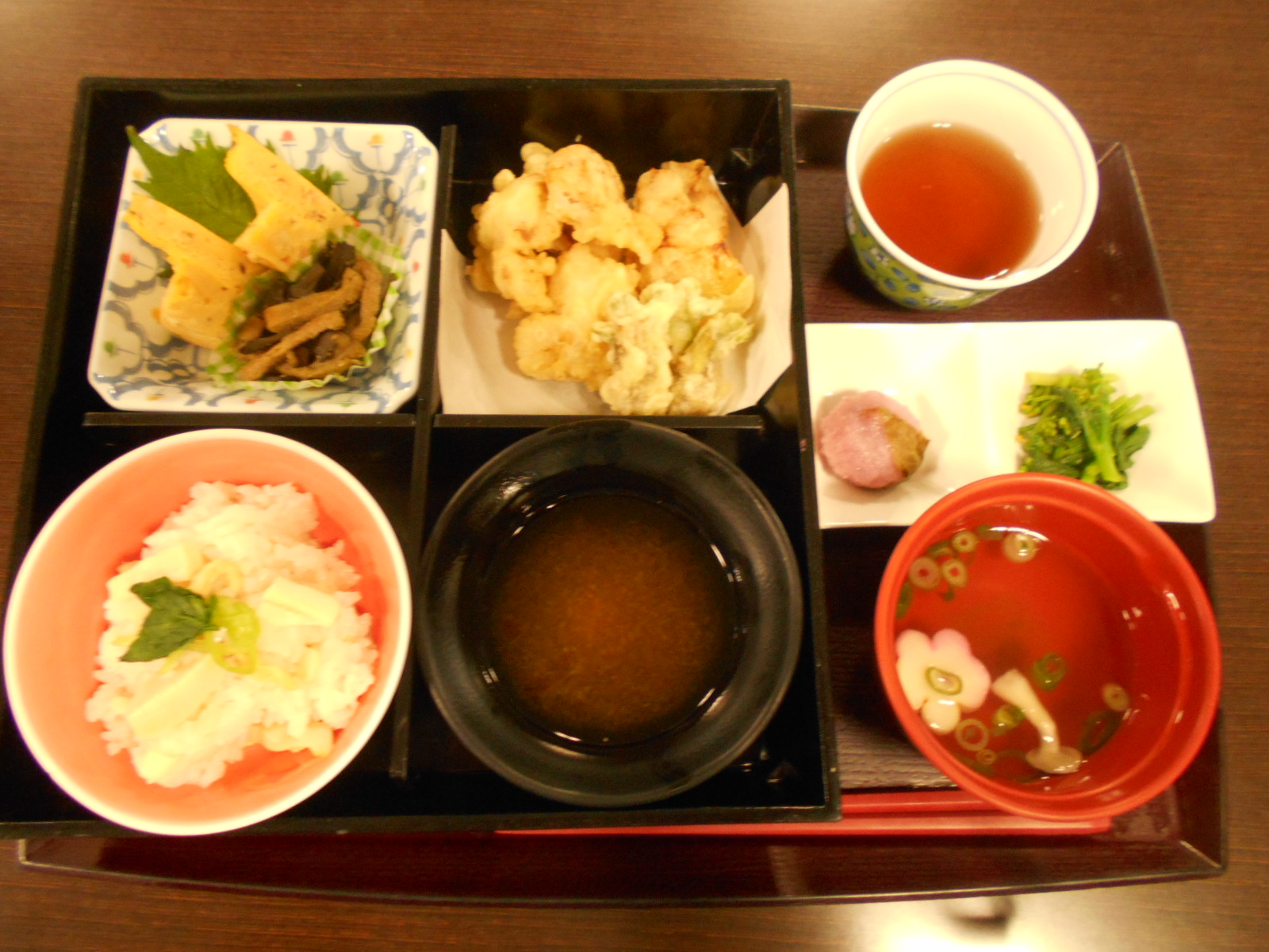 玉葱とタラの天ぷら・厚焼き卵・すまし汁・桜餅となります。