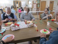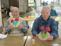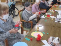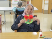 こんにちはデイサービスです。今日は母の日のカーネーション飾りを制作しました。お花紙で赤色のカーネーションのお花の部分を作り、茎と葉っぱは緑色の折り紙を使用しています。台紙にリボンや「お母さんありがとう」のメッセージも貼って完成です(*^-^*)「こんな素敵なカーネーションができた」「部屋に飾るのが楽しみ」と皆様とても嬉しそうでした(≧▽≦)