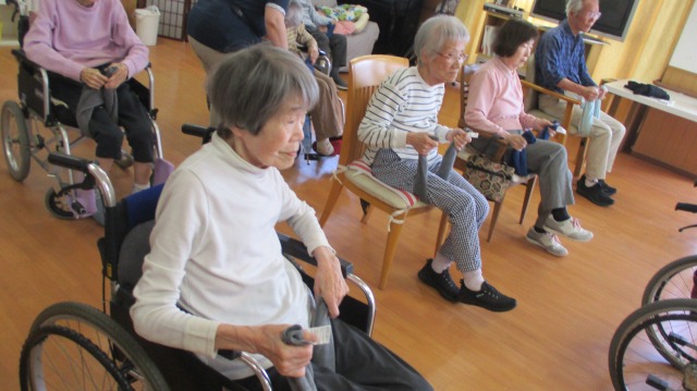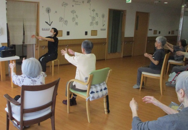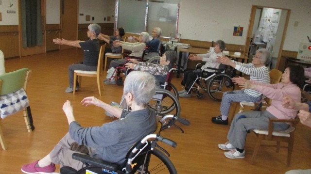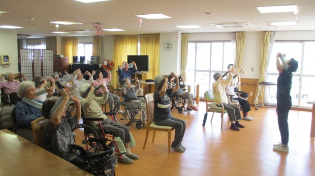 今回はタオルを使って体をほぐしたり、伸ばしたりといつもと違う体操がメイン🌟タオルを使うことによりぐんぐん体が伸びてとっても気持ちが良かったです(^^)/皆様、とてもお上手に先生を真似て頑張ってくださっていました(*^▽^*)最後は音楽に合わせて手足を大きく動かし、体操を楽しみました☆彡窓を開けていましたが、終わりには汗をかくほど…(;’∀’)ご入居者様もやりきった~‼とすがすがしい表情をされていましたよ!(^^)!