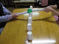 ラップの芯でボールを挟み落とさない様に紙コップの上に置いていくゲームです。