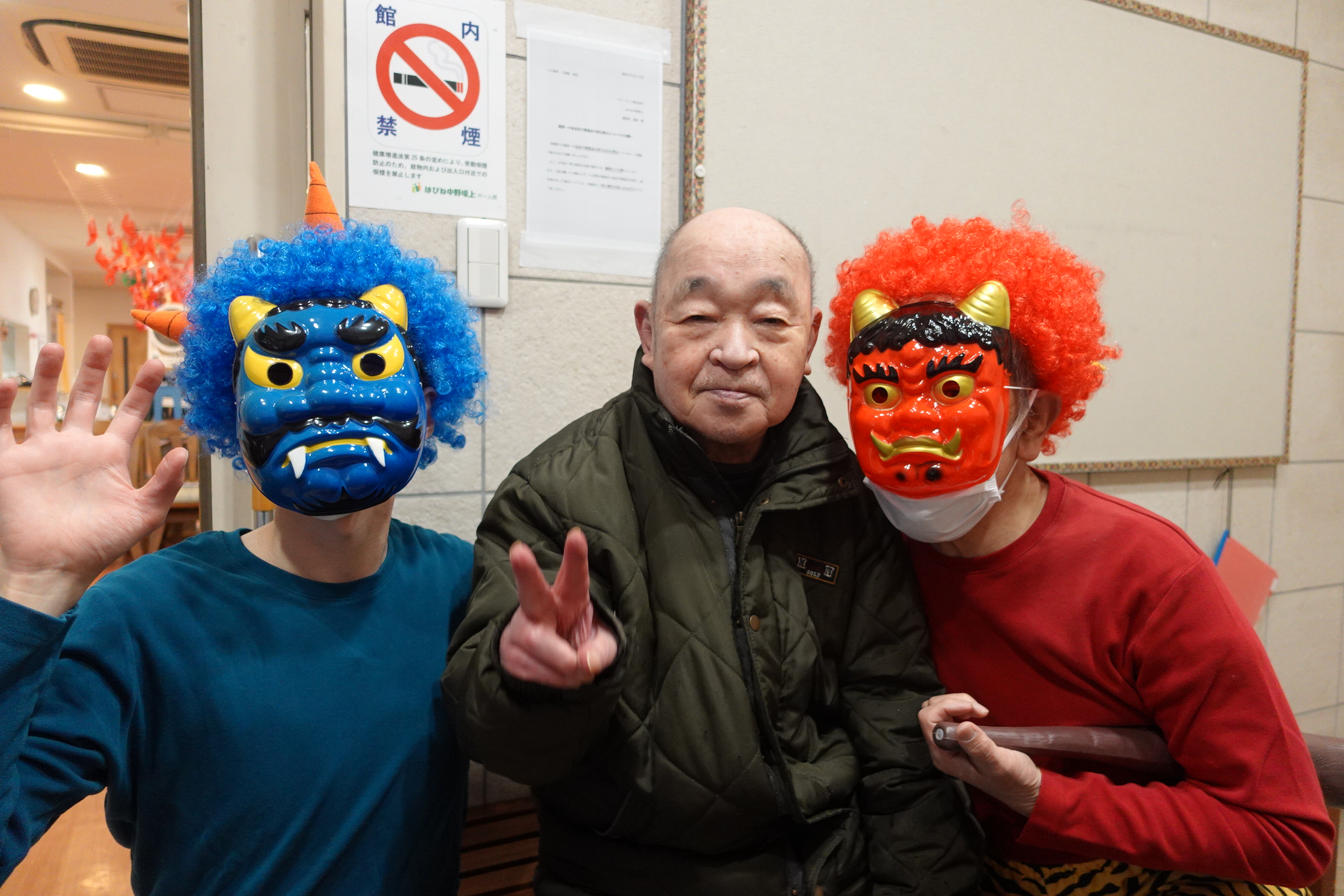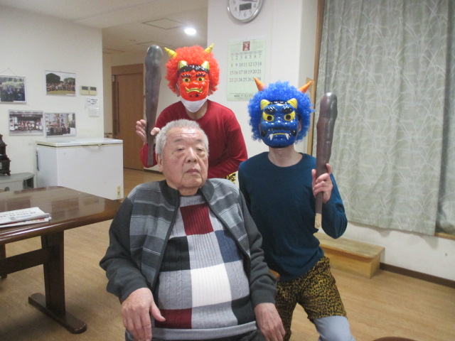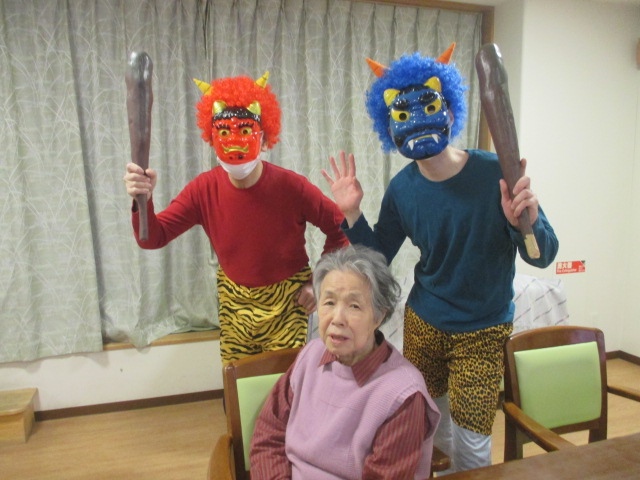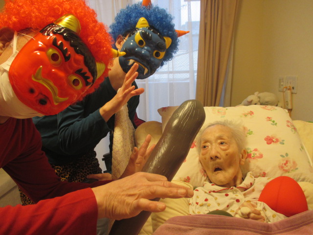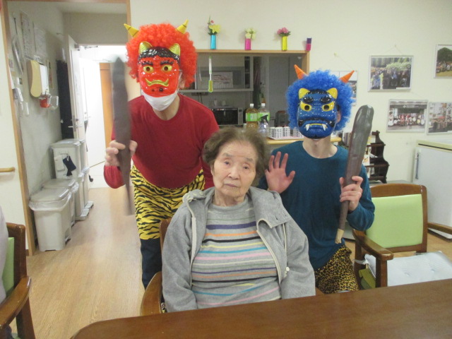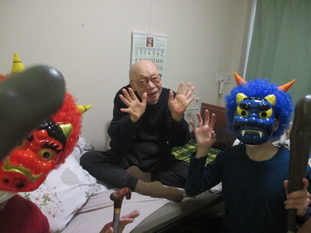 入居者様も負けじと豆を投げて鬼をやっつけます!