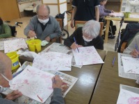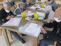 こんにちは、デイサービスです。今日は水彩画教室ということで桜の下絵を使って水彩画を行いました。皆さん集中して黙々と絵具で色付けをしてくださっていました。BGMは「さくらさくら」を流して雰囲気作りも怠りません(*^_^*) ピンクだけかと思いきや、意外と枝と花の間は黄緑色を使ったりと塗る場所が細かい場所もあり、「思ったより時間がかかるね」「きれいに仕上がってよかった」と声が聞こえてきました✨