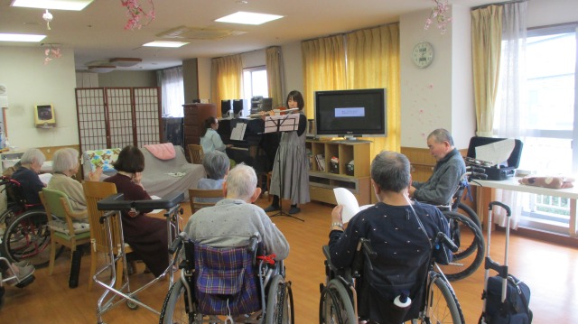 本日は4/6に行われました【音楽療法】の様子をお伝え致します(^^)🎤甲子園にゆかりのあるご入居者様がいらっしゃる事から、高校野球でお馴染みの『栄冠は君に輝く』を演奏してくださりたいへん盛り上がりました‼他にも皆様がお好きな曲ばかりで、あちこちから歌声が聞こえてきました♬これからもリクエストがあれば何でも演奏してくださるそうなので、皆様お楽しみに~~~(⋈◍>◡<◍)。✧♡次回は6月です♬