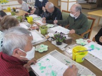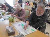 こんにちは、デイサービスです。今日の水彩画教室はパンジーの下絵を使って行いました。お花の色がわからない方もいるかなと心配した職員が本物のパンジーも持ってきてくださり、たくさんの色の種類があるパンジーなので、ご利用者様も何色にしたらよいか悩んでいらっしゃいました(*^-^*)下絵にもたくさんパンジーが描かれていたので完成させるのも大変だったご様子です。完成した作品を見てお隣同士で褒め合う様子も見られました✨